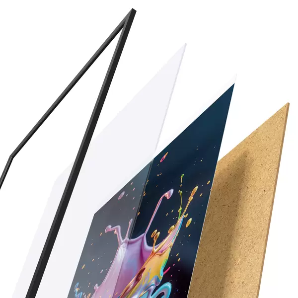 Das Poster besteht aus einem Rahmen, Plexiglas, einem gedruckten Bild und einer Rückwand aus Spanplatten. Dank der Halterungen auf der Rückseite kann das Poster sofort an die Wand gehängt werden.