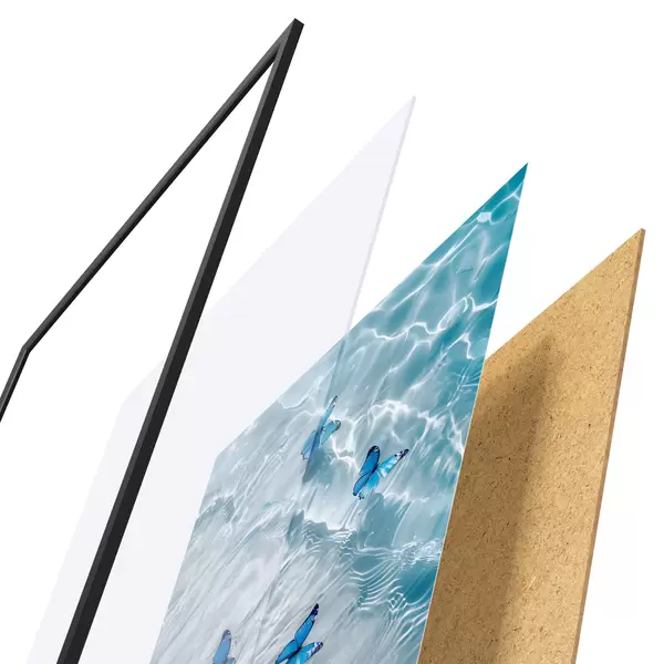 Das Poster besteht aus einem Rahmen, Plexiglas, einem gedruckten Bild und einer Rückwand aus Spanplatten. Dank der Halterungen auf der Rückseite kann das Poster sofort an die Wand gehängt werden.