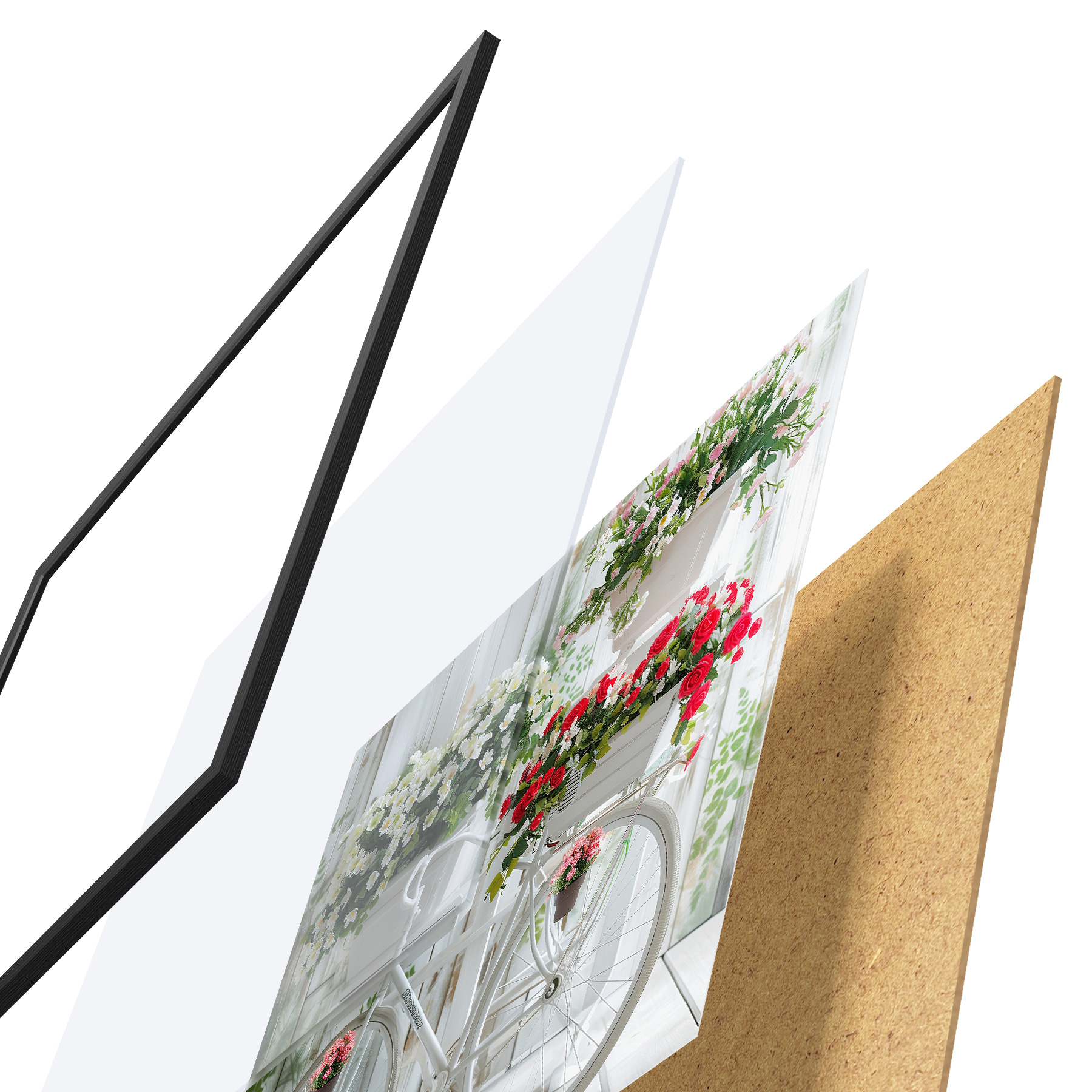Das Poster besteht aus einem Rahmen, Plexiglas, einem gedruckten Bild und einer Rückwand aus Spanplatten. Dank der Halterungen auf der Rückseite kann das Poster sofort an die Wand gehängt werden.