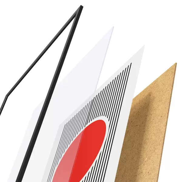 Das Poster besteht aus einem Rahmen, Plexiglas, einem gedruckten Bild und einer Rückwand aus Spanplatten. Dank der Halterungen auf der Rückseite kann das Poster sofort an die Wand gehängt werden.