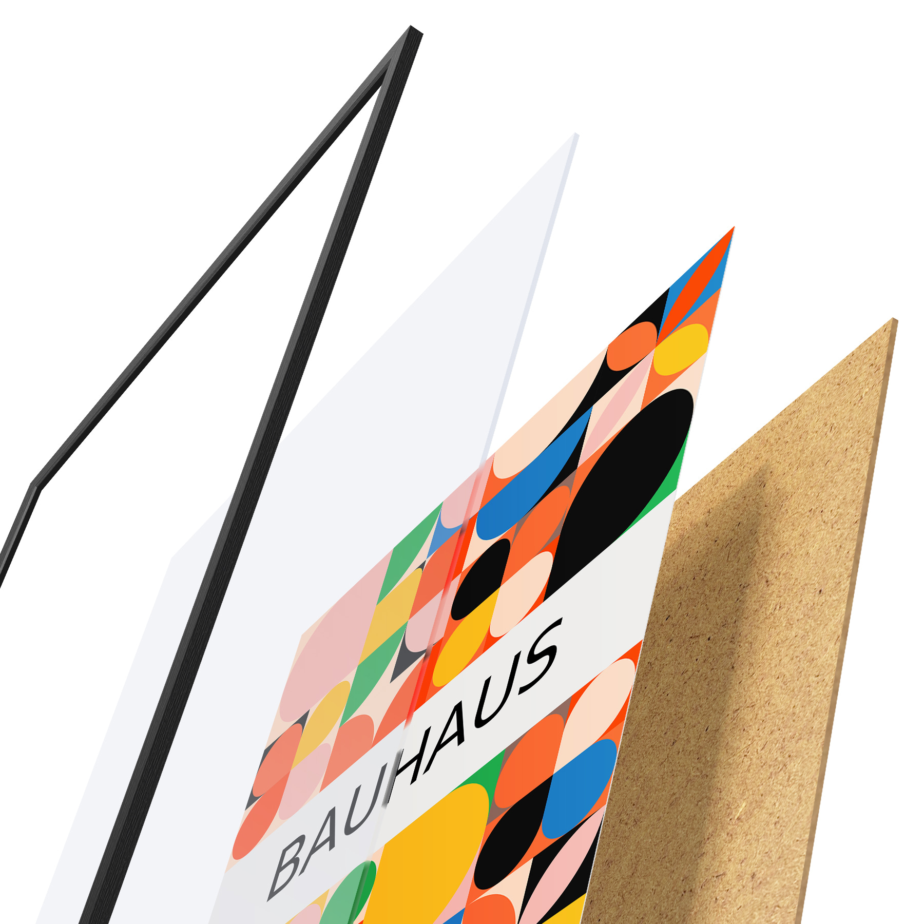Das Poster besteht aus einem Rahmen, Plexiglas, einem gedruckten Bild und einer Rückwand aus Spanplatten. Dank der Halterungen auf der Rückseite kann das Poster sofort an die Wand gehängt werden.