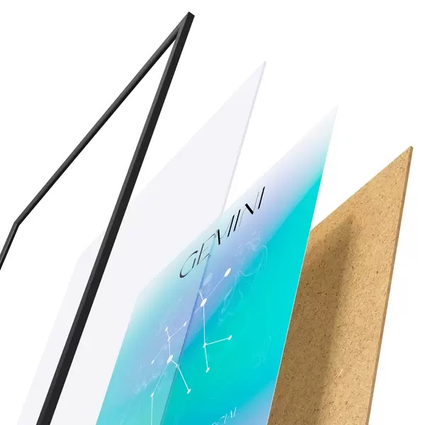 Das Poster besteht aus einem Rahmen, Plexiglas, einem gedruckten Bild und einer Rückwand aus Spanplatten. Dank der Halterungen auf der Rückseite kann das Poster sofort an die Wand gehängt werden.