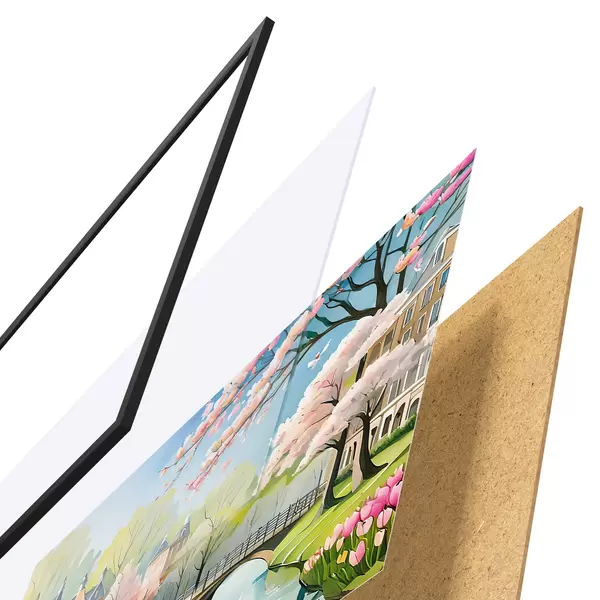 Das Poster besteht aus einem Rahmen, Plexiglas, einem gedruckten Bild und einer Rückwand aus Spanplatten. Dank der Halterungen auf der Rückseite kann das Poster sofort an die Wand gehängt werden.