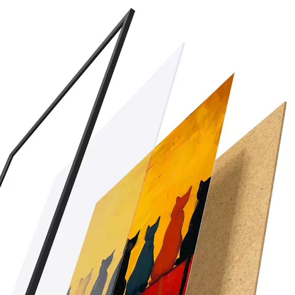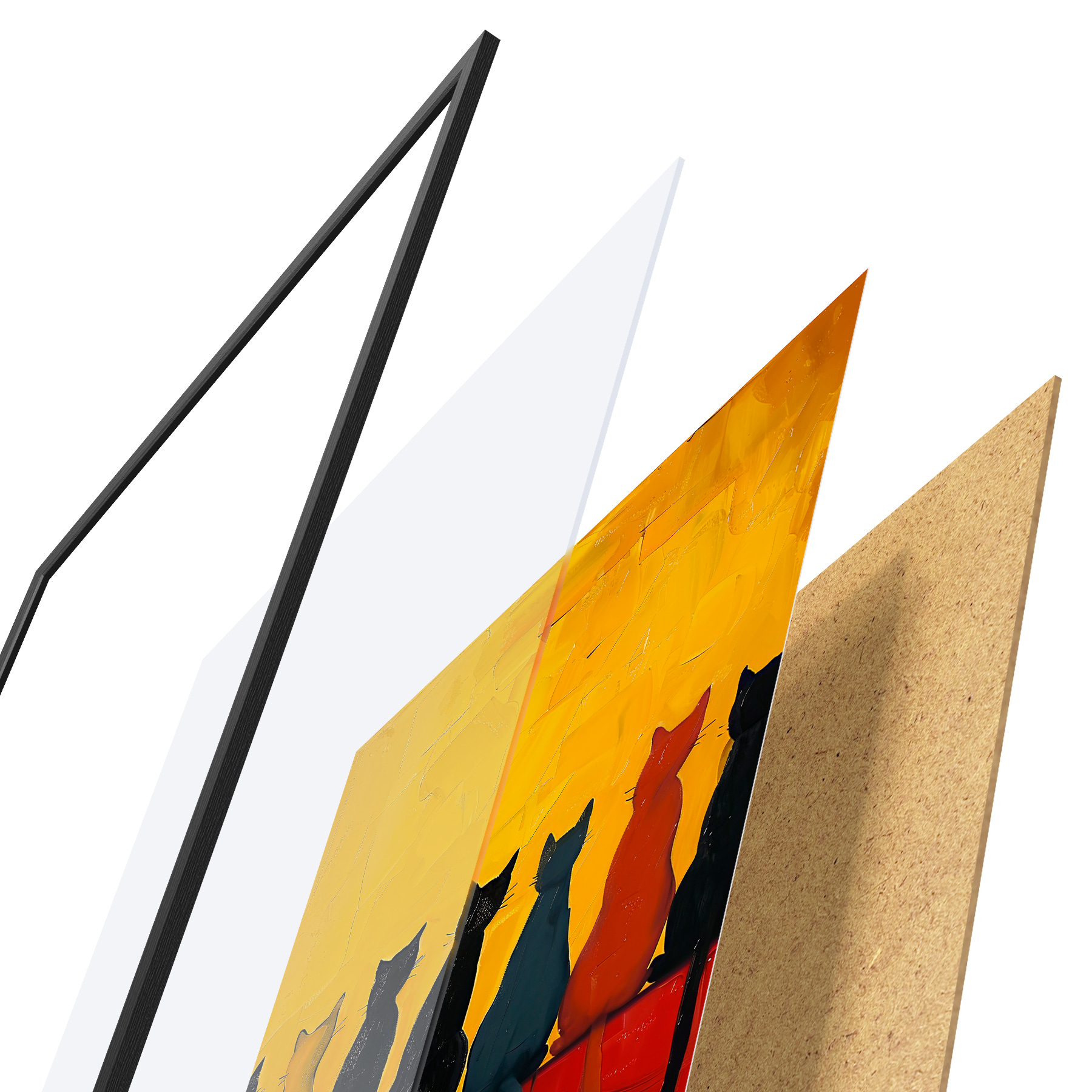 Das Poster besteht aus einem Rahmen, Plexiglas, einem gedruckten Bild und einer Rückwand aus Spanplatten. Dank der Halterungen auf der Rückseite kann das Poster sofort an die Wand gehängt werden.