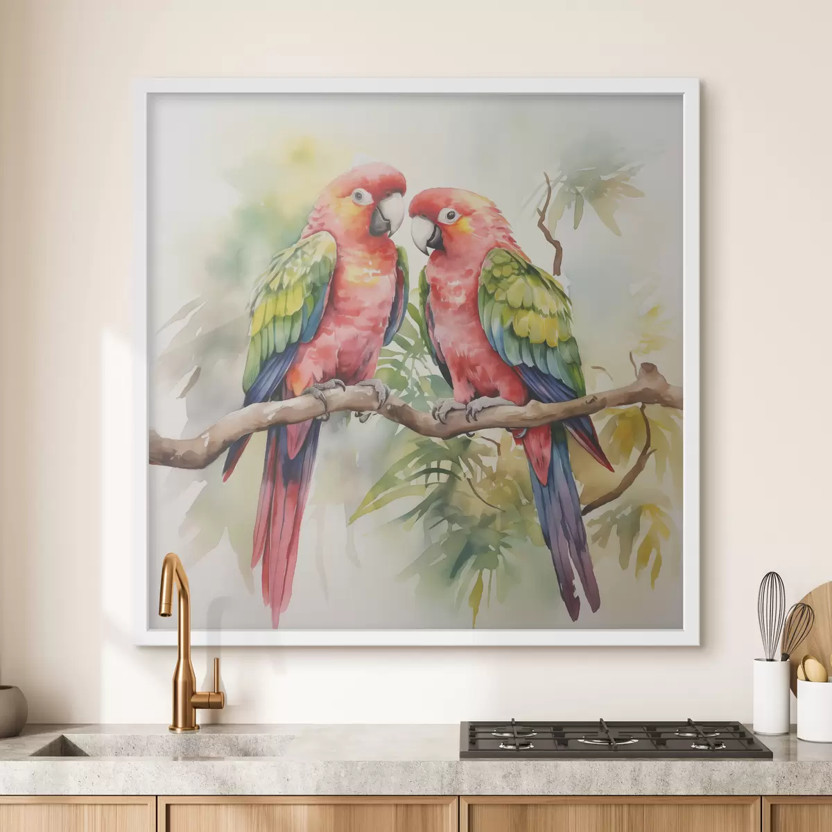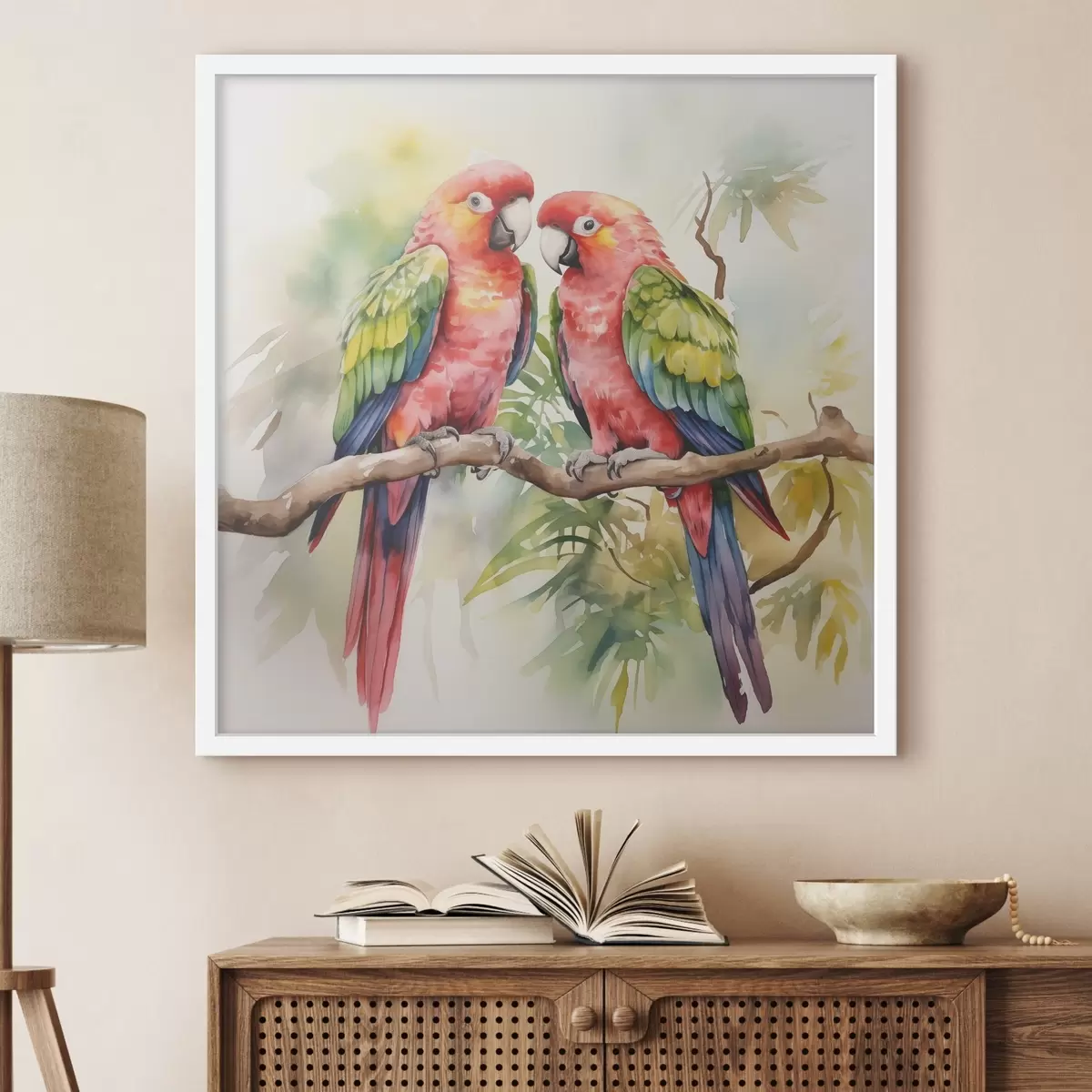 Poster Zwei helle Ara-Papageien sitzen auf einem Aquarell auf einem Ast Nr f39333
