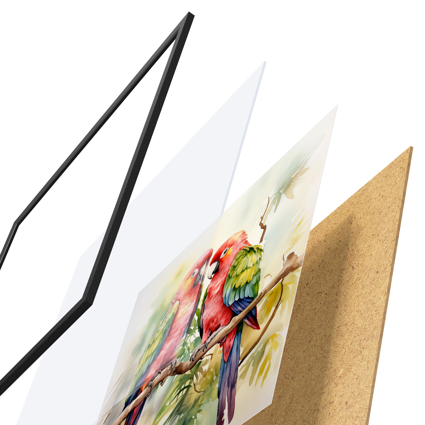 Das Poster besteht aus einem Rahmen, Plexiglas, einem gedruckten Bild und einer Rückwand aus Spanplatten. Dank der Halterungen auf der Rückseite kann das Poster sofort an die Wand gehängt werden.
