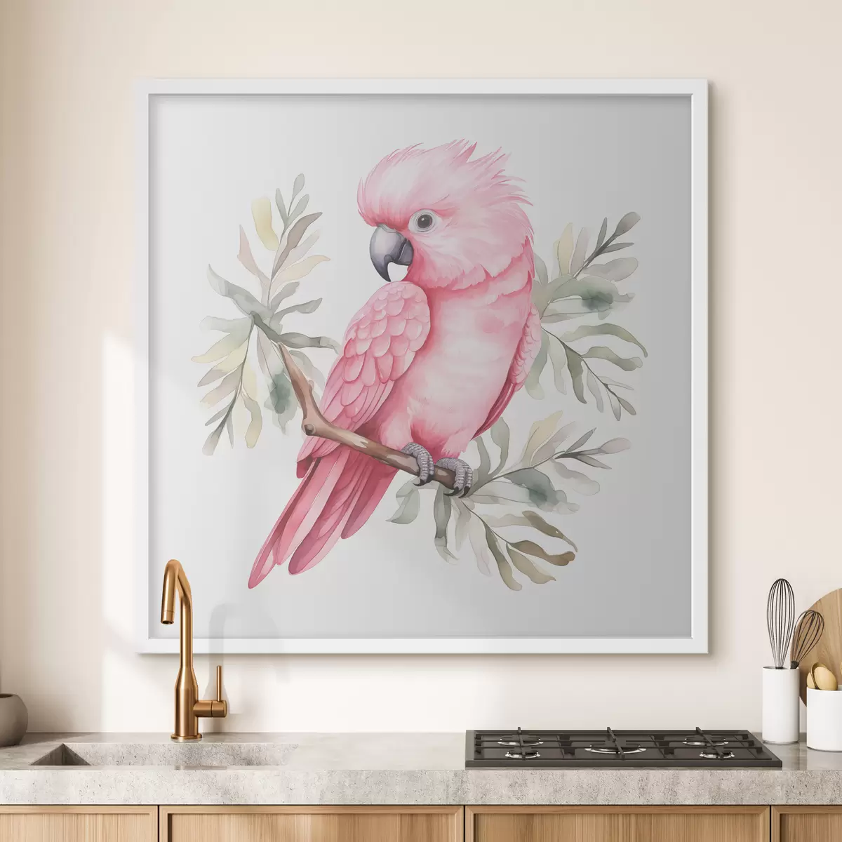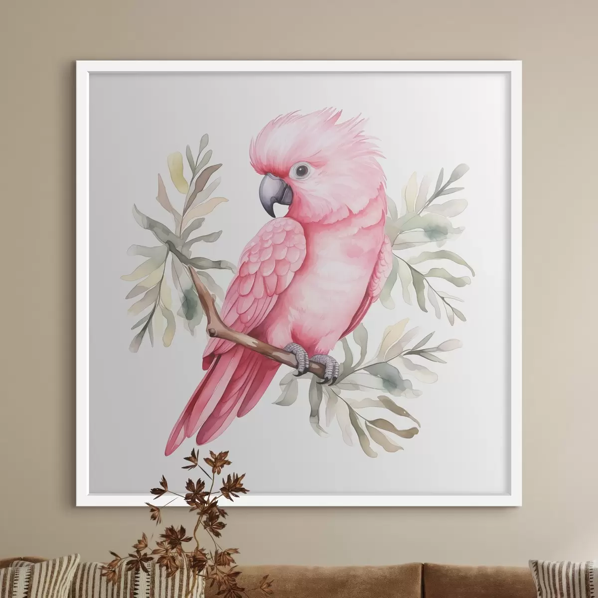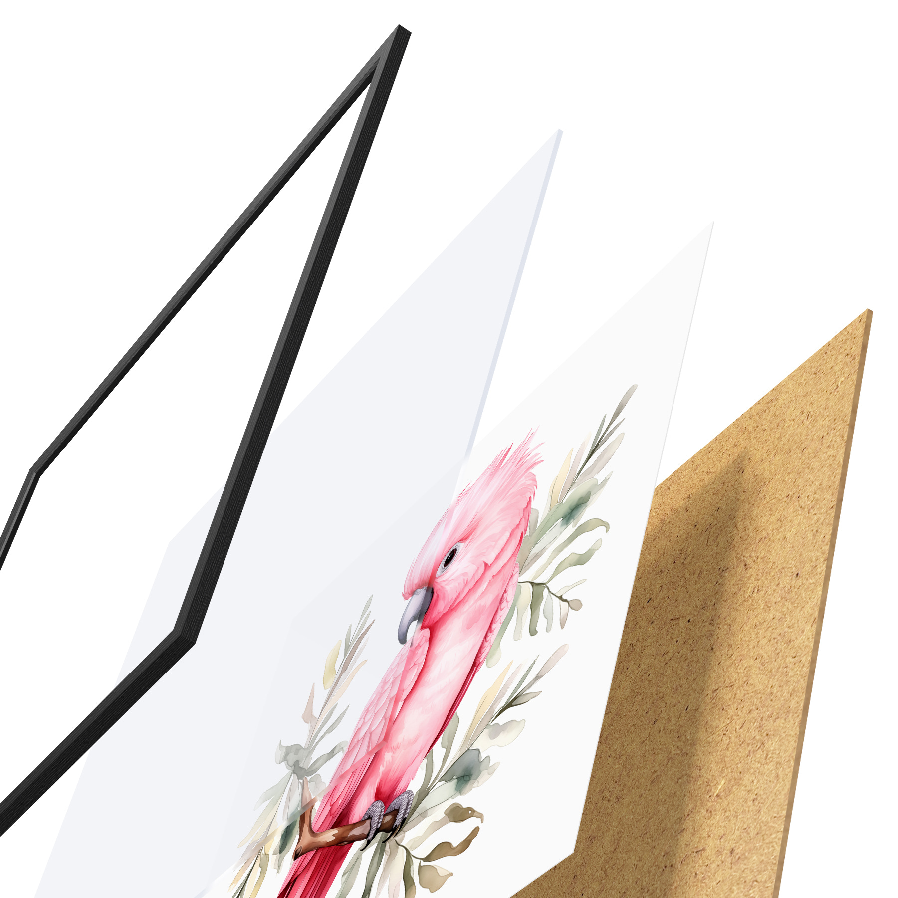 Poster Ein rosa Kakadupapagei sitzt auf einem Aquarellzweig Nr f39334
