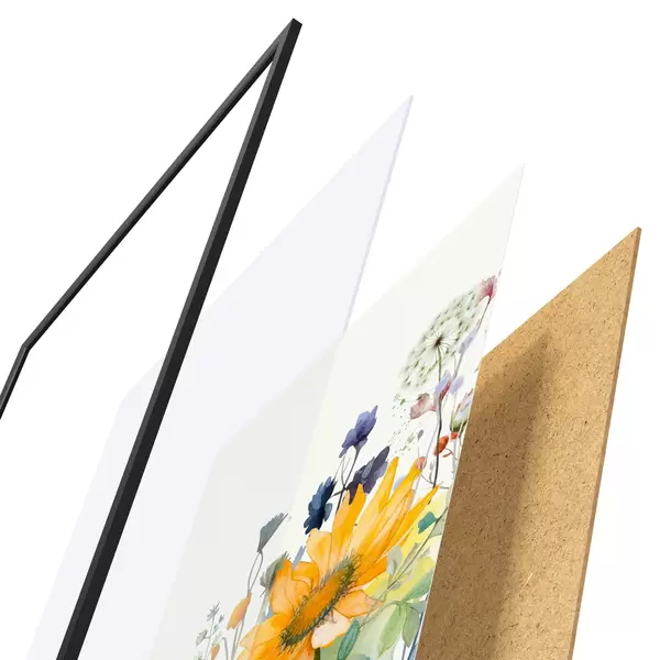 Das Poster besteht aus einem Rahmen, Plexiglas, einem gedruckten Bild und einer Rückwand aus Spanplatten. Dank der Halterungen auf der Rückseite kann das Poster sofort an die Wand gehängt werden.