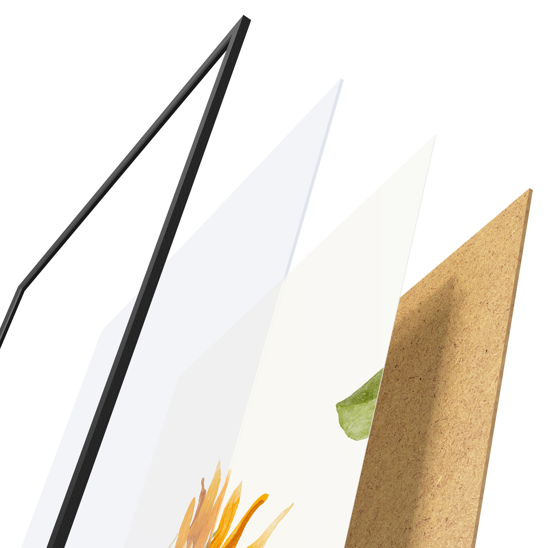 Das Poster besteht aus einem Rahmen, Plexiglas, einem gedruckten Bild und einer Rückwand aus Spanplatten. Dank der Halterungen auf der Rückseite kann das Poster sofort an die Wand gehängt werden.
