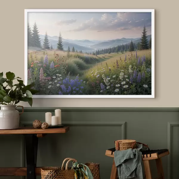 Poster Berglandschaft mit einer Graswiese im Vordergrund voller bunter Wildblumen Nr f39382