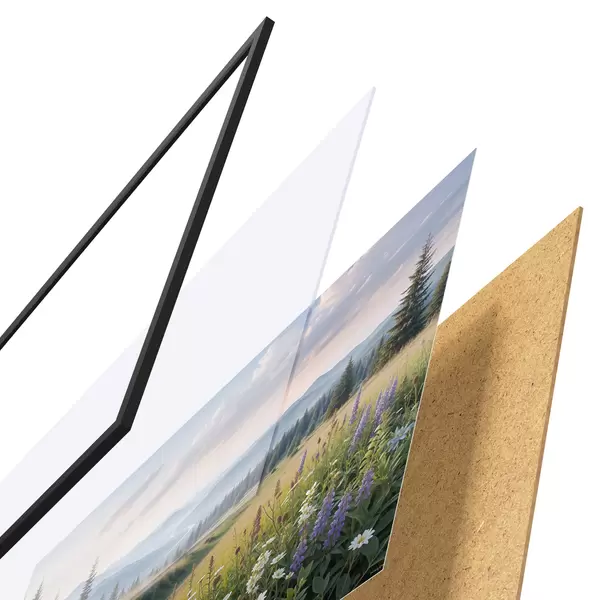 Das Poster besteht aus einem Rahmen, Plexiglas, einem gedruckten Bild und einer Rückwand aus Spanplatten. Dank der Halterungen auf der Rückseite kann das Poster sofort an die Wand gehängt werden.