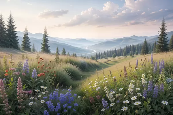 Poster Berglandschaft mit einer Graswiese im Vordergrund voller bunter Wildblumen Nr f39382
