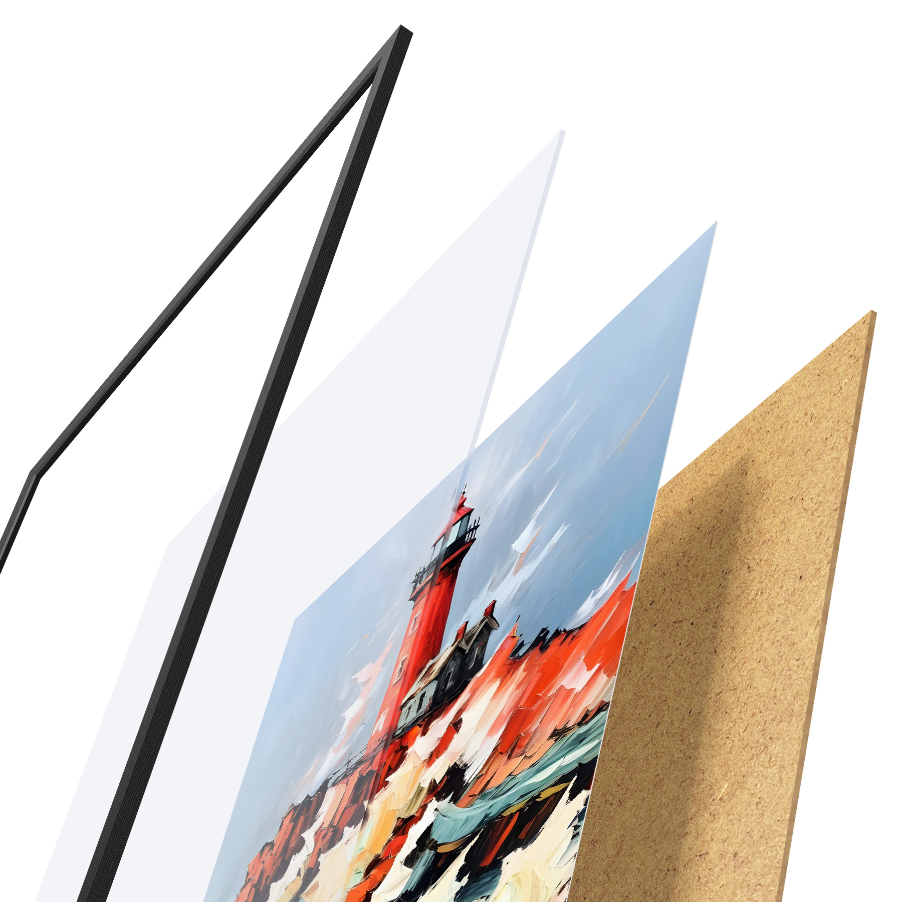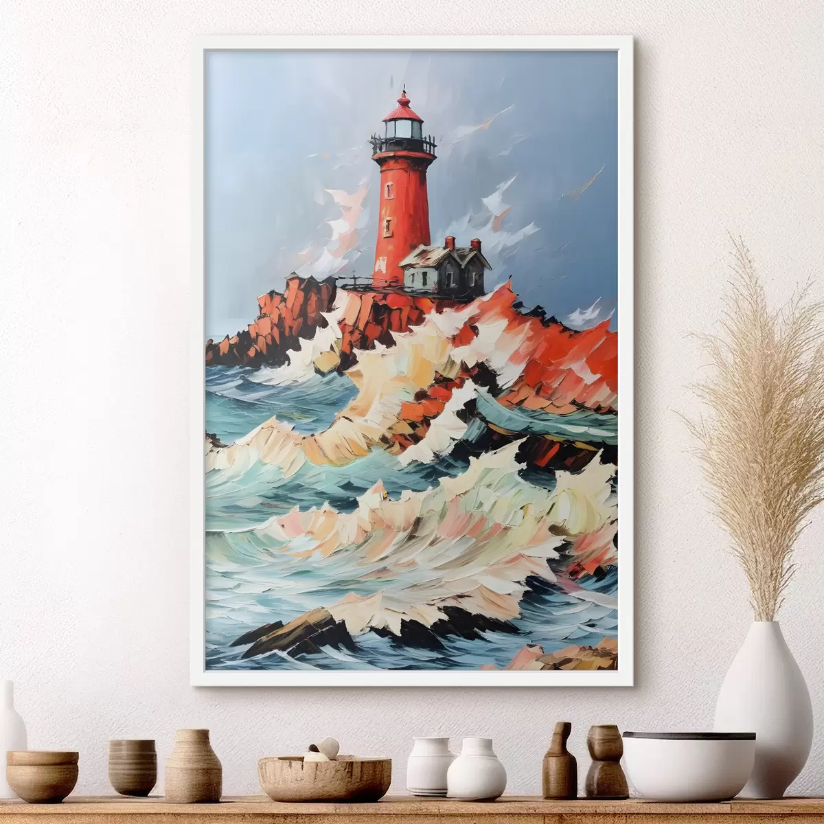 Poster Gemälde eines roten Leuchtturms, der hoch auf einer felsigen Klippe steht, umgeben von tosenden Wellen und einem stürmischen Himmel f39392