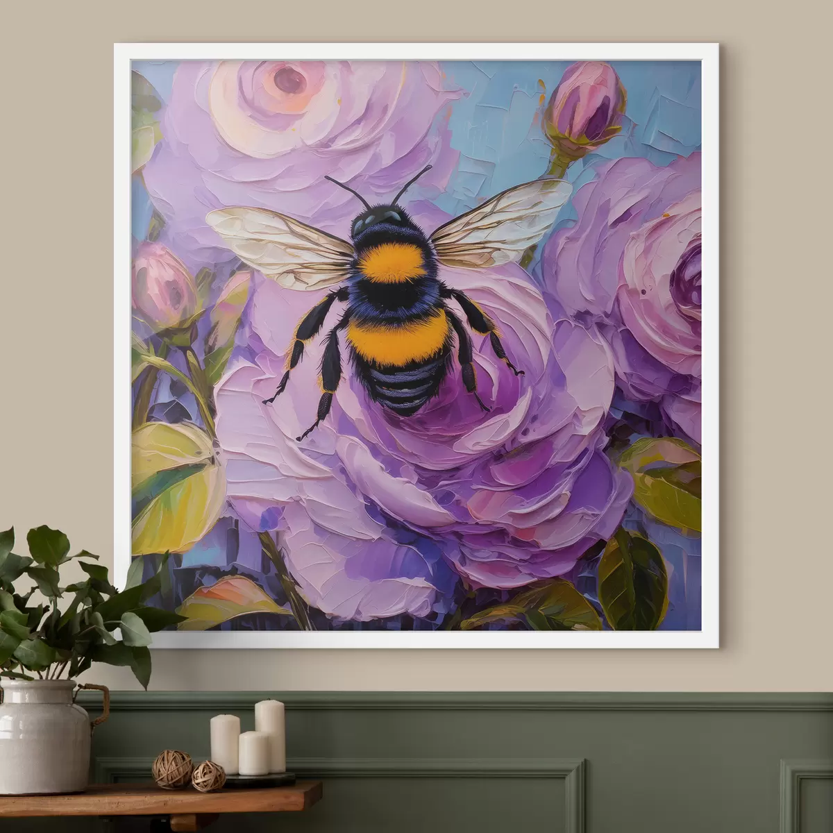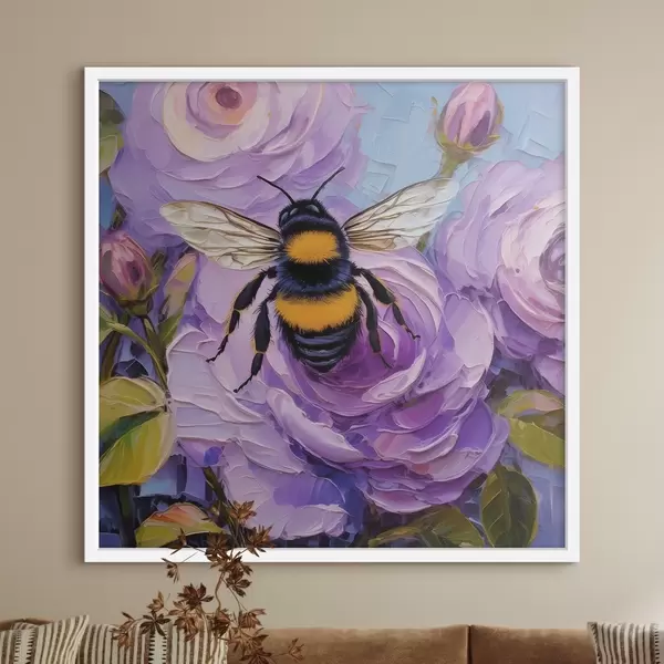 Poster Biene auf rosa Pfingstrosen, bunte Sommerblumen, Ölgemälde, lebhafte Pinselstriche Nr f39411