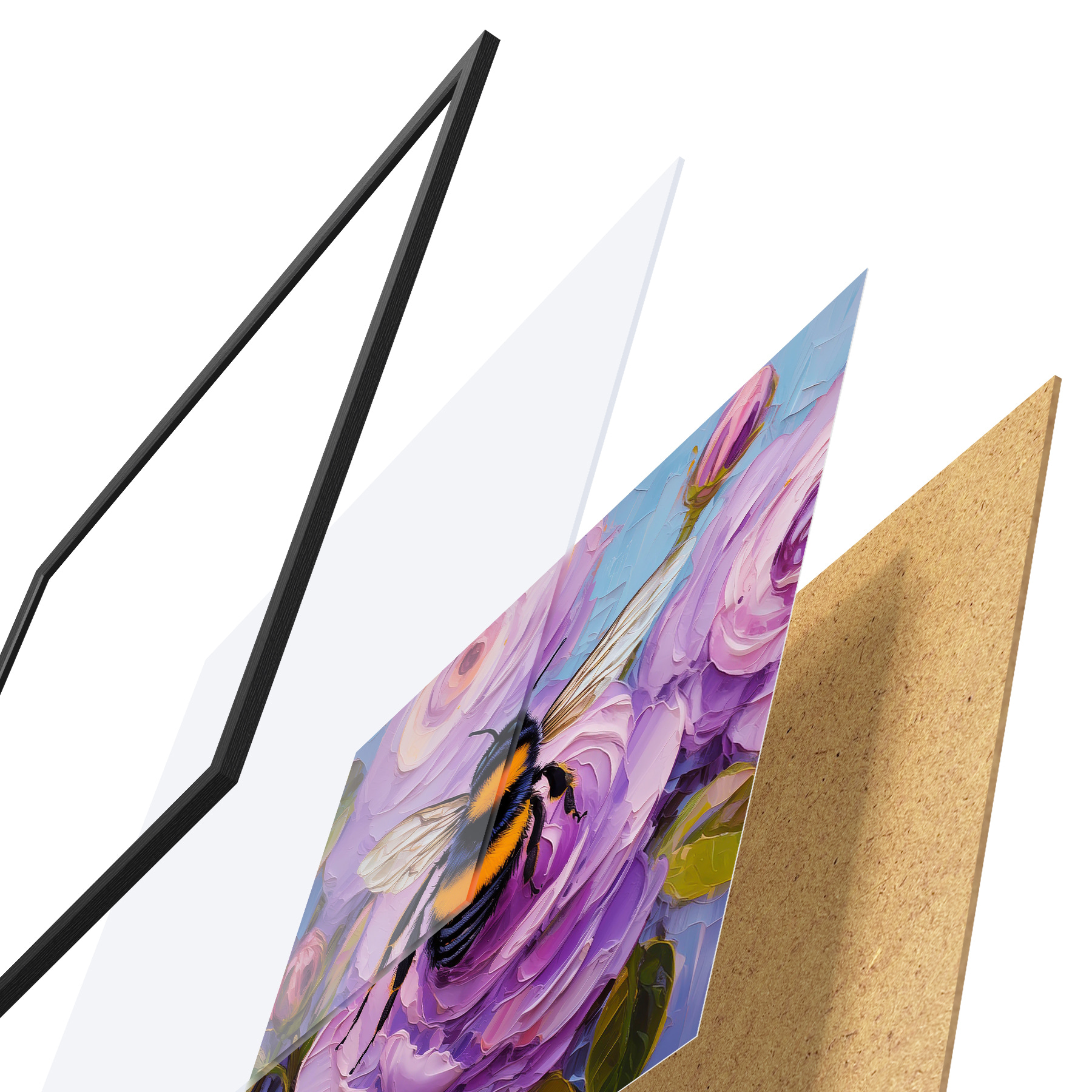Das Poster besteht aus einem Rahmen, Plexiglas, einem gedruckten Bild und einer Rückwand aus Spanplatten. Dank der Halterungen auf der Rückseite kann das Poster sofort an die Wand gehängt werden.