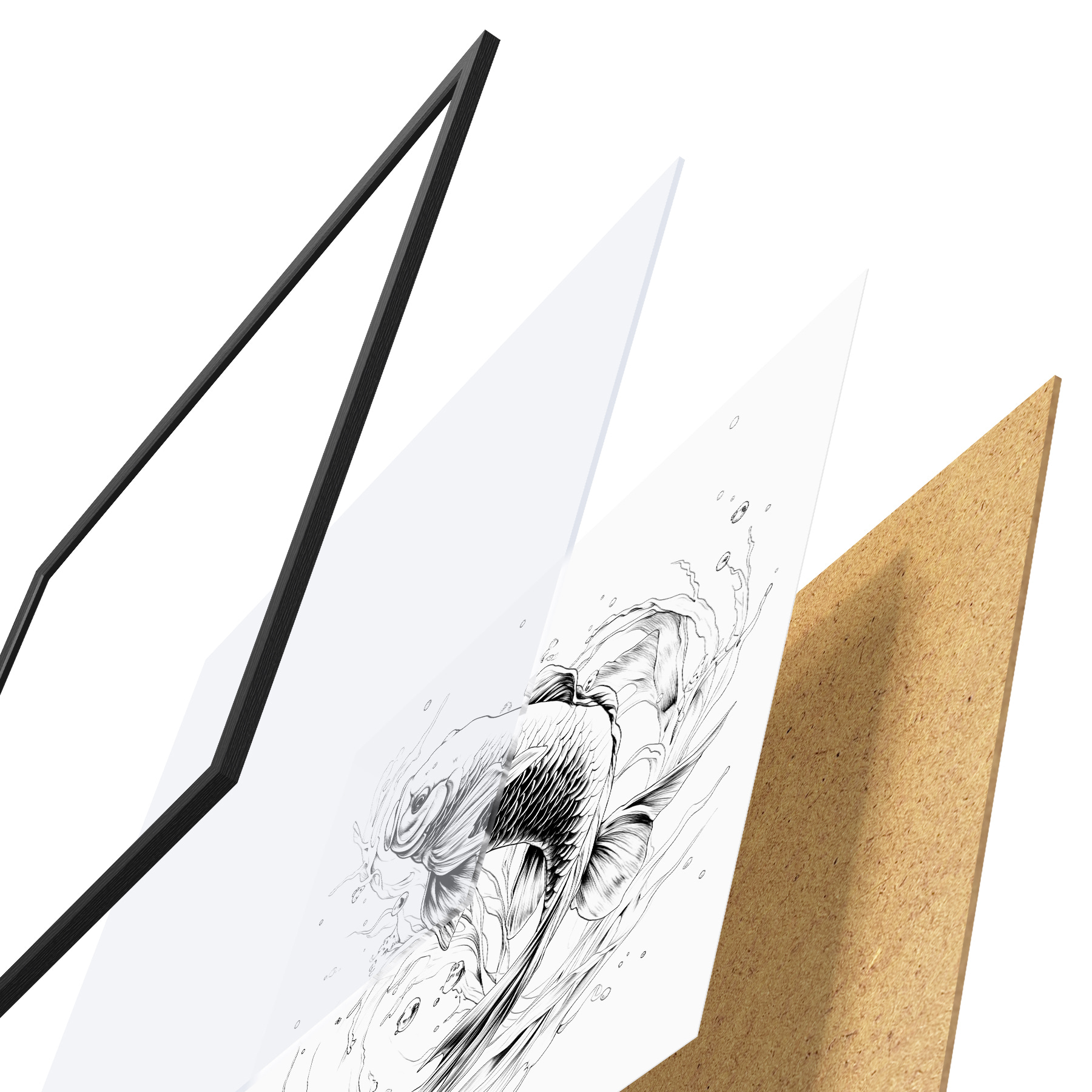 Das Poster besteht aus einem Rahmen, Plexiglas, einem gedruckten Bild und einer Rückwand aus Spanplatten. Dank der Halterungen auf der Rückseite kann das Poster sofort an die Wand gehängt werden.