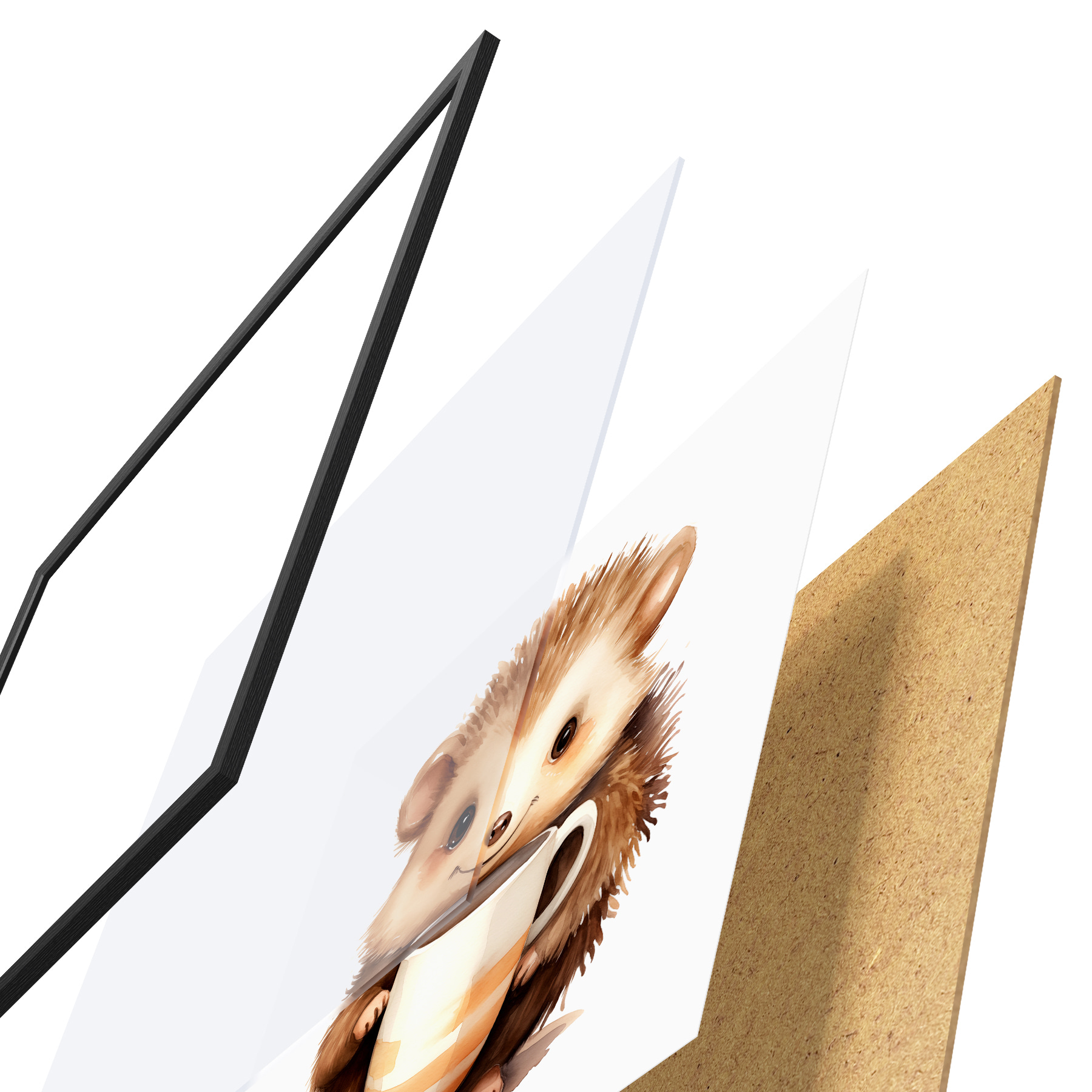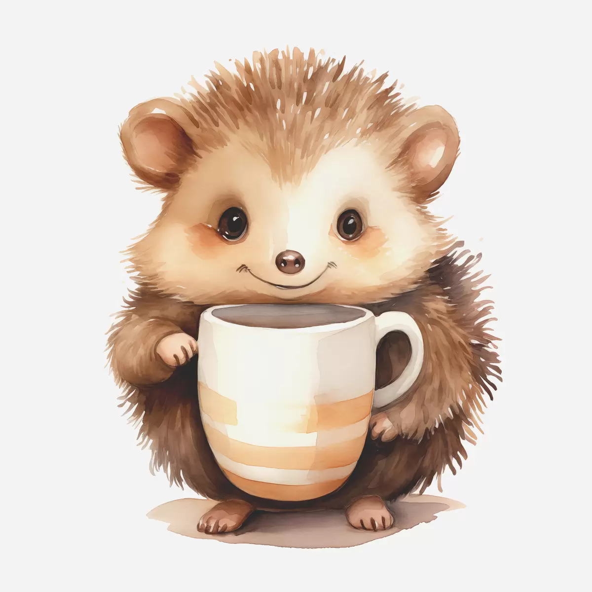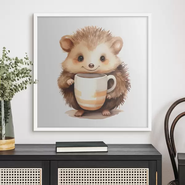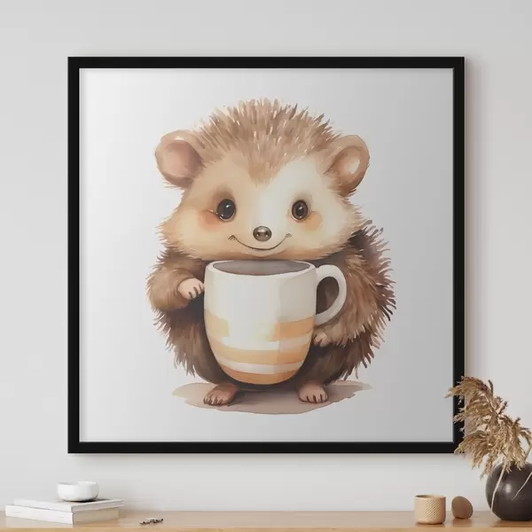 Poster Igel hält eine weiße Tasse in seinen Pfoten Aquarell Illustration für Kinder f39440