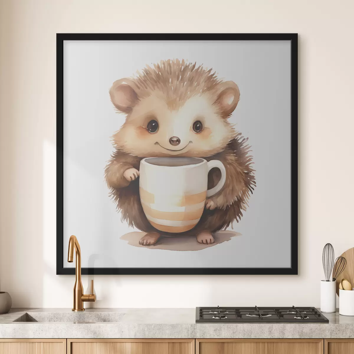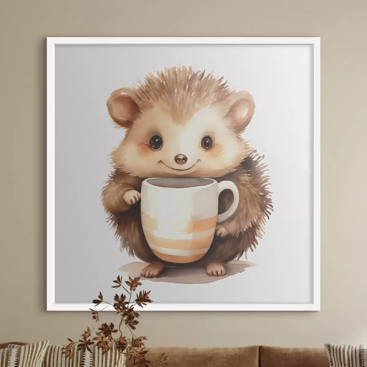 Poster Igel hält eine weiße Tasse in seinen Pfoten Aquarell Illustration für Kinder Nr f39440