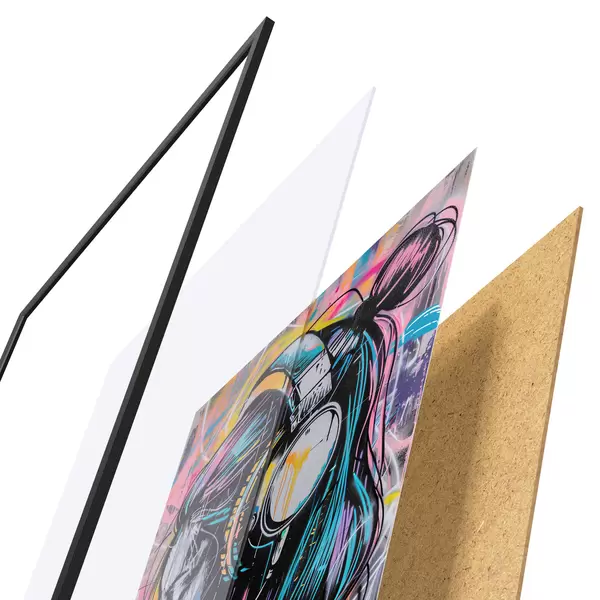 Das Poster besteht aus einem Rahmen, Plexiglas, einem gedruckten Bild und einer Rückwand aus Spanplatten. Dank der Halterungen auf der Rückseite kann das Poster sofort an die Wand gehängt werden.