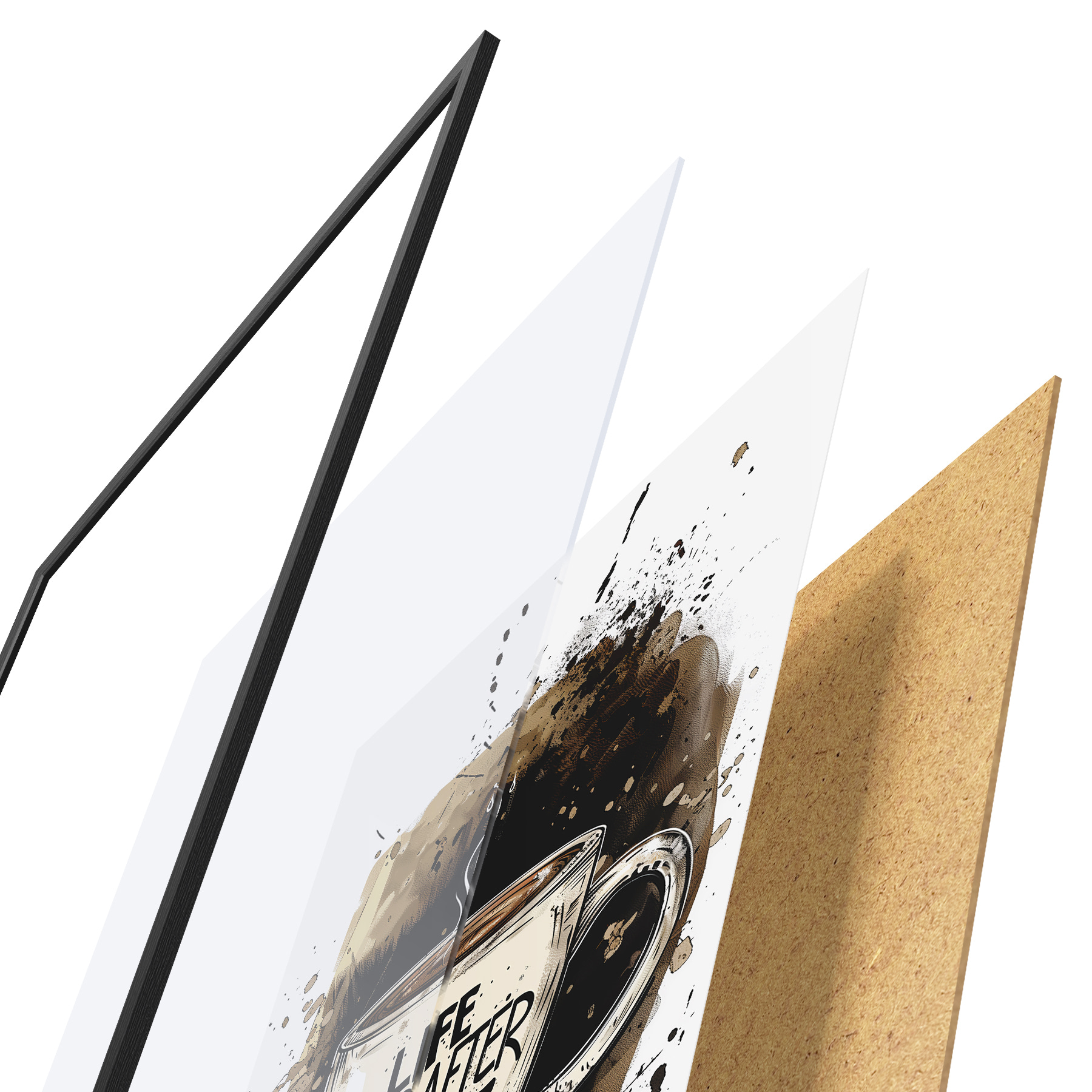 Das Poster besteht aus einem Rahmen, Plexiglas, einem gedruckten Bild und einer Rückwand aus Spanplatten. Dank der Halterungen auf der Rückseite kann das Poster sofort an die Wand gehängt werden.