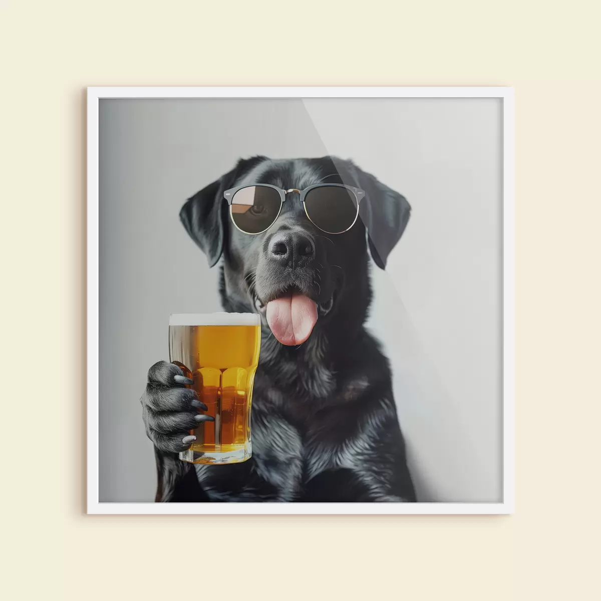 Poster Porträt eines schwarzen Labradors mit Sonnenbrille und einem Bierkrug in der Hand, der direkt in die Kamera schaut Nr f39470