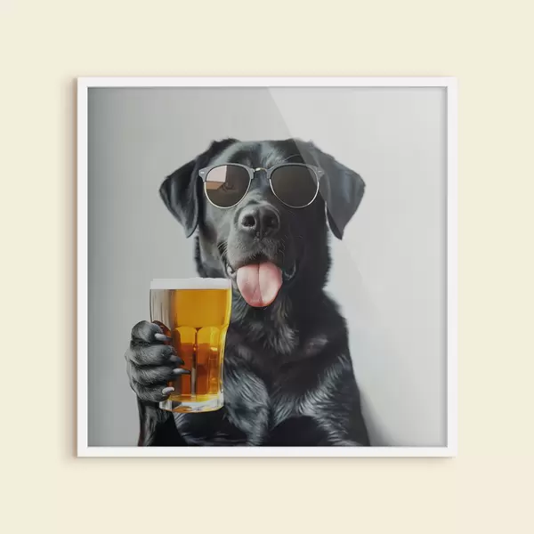 Poster Porträt eines schwarzen Labradors mit Sonnenbrille und einem Bierkrug in der Hand, der direkt in die Kamera schaut f39470