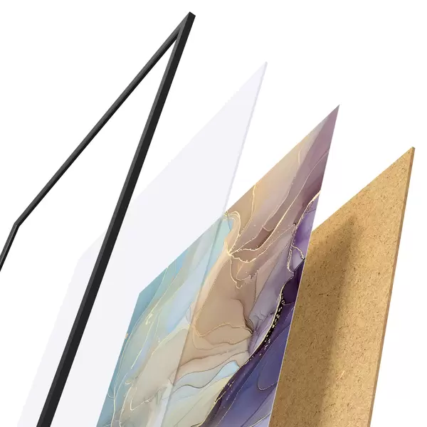 Das Poster besteht aus einem Rahmen, Plexiglas, einem gedruckten Bild und einer Rückwand aus Spanplatten. Dank der Halterungen auf der Rückseite kann das Poster sofort an die Wand gehängt werden.