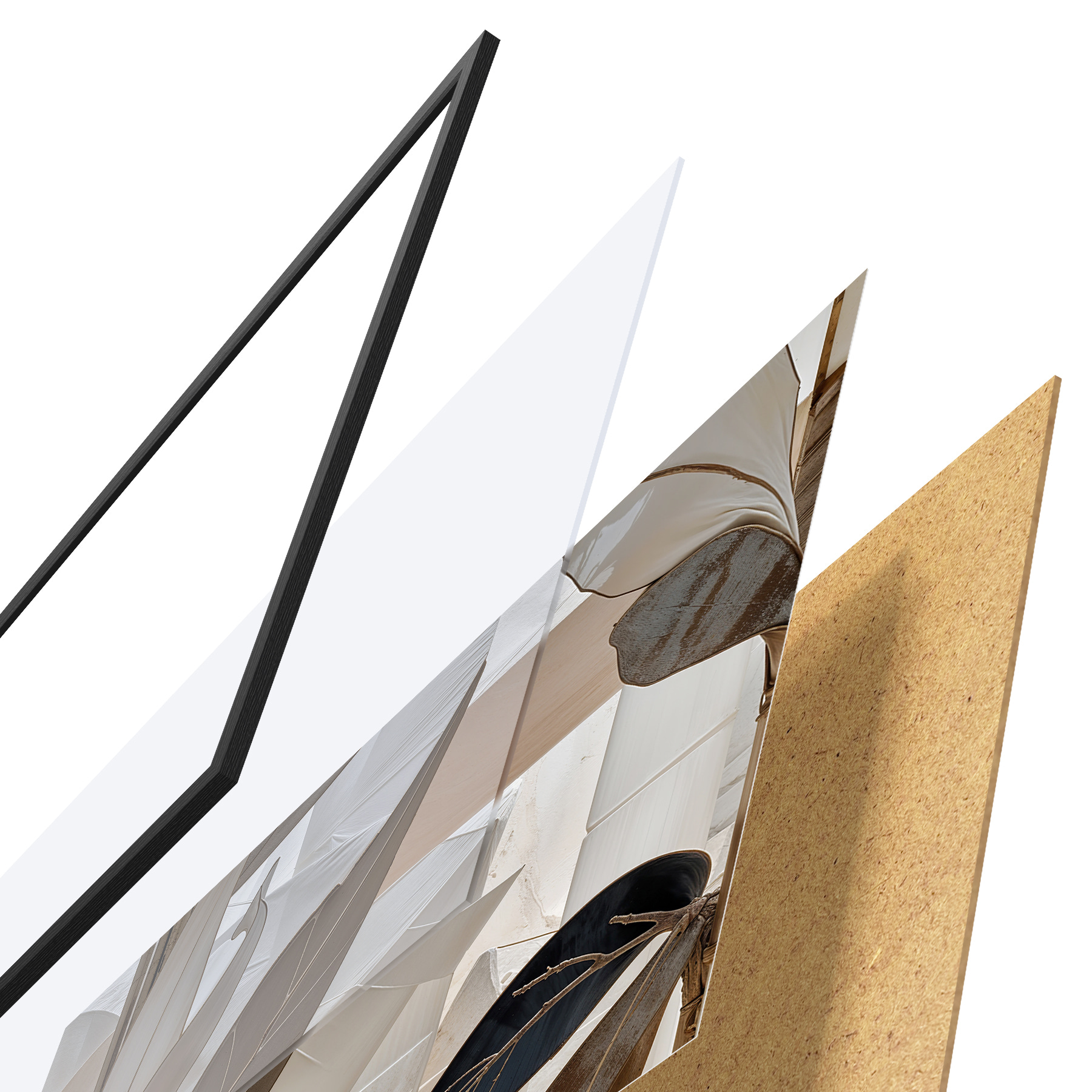 Das Poster besteht aus einem Rahmen, Plexiglas, einem gedruckten Bild und einer Rückwand aus Spanplatten. Dank der Halterungen auf der Rückseite kann das Poster sofort an die Wand gehängt werden.