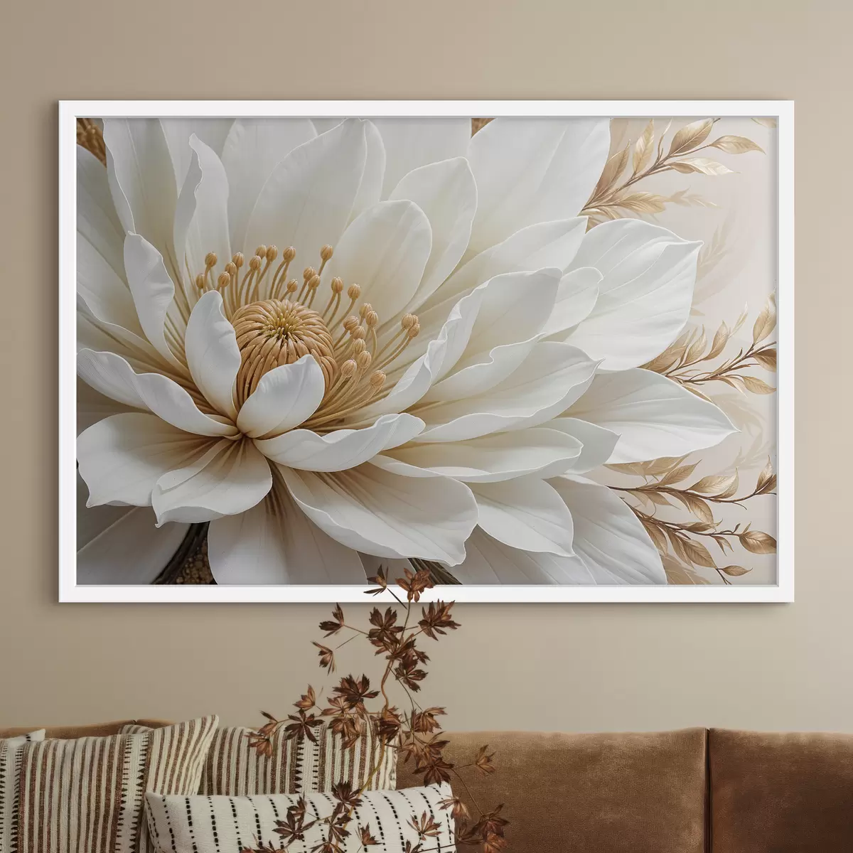 Poster Eine Nahaufnahme einer großen, weißen Dahlienblüte mit zarten Blütenblättern und einer leuchtend gelben Mitte f39508