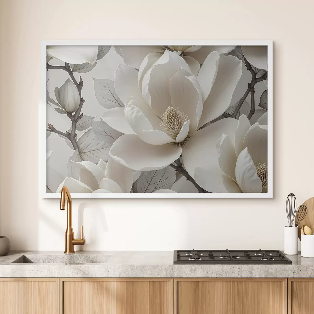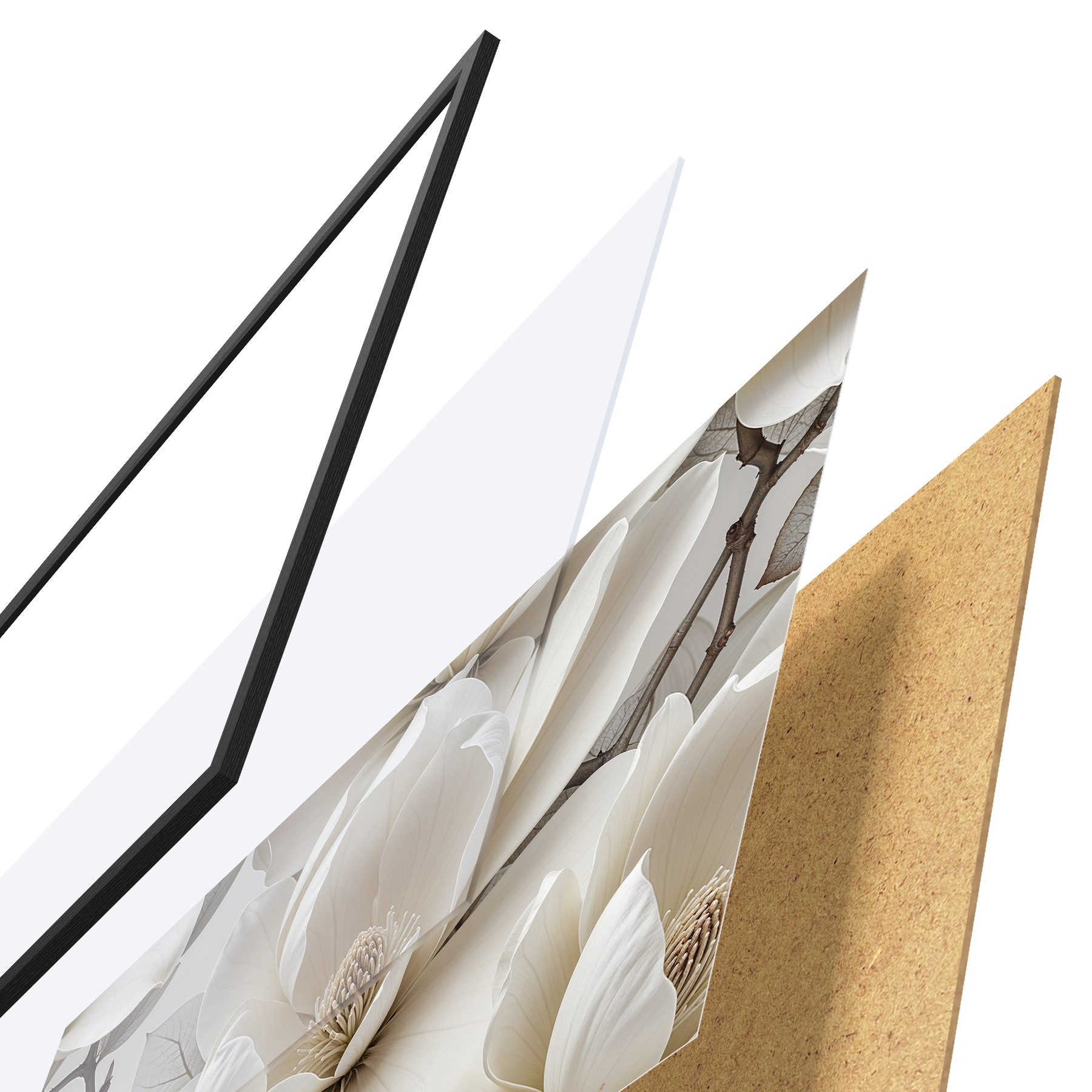Poster Weiße Magnolienblüte mit zarten Blütenblättern, umgeben von grünen Blättern vor hellem Hintergrund Nr f39527