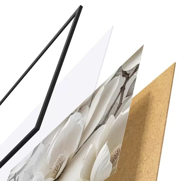 Das Poster besteht aus einem Rahmen, Plexiglas, einem gedruckten Bild und einer Rückwand aus Spanplatten. Dank der Halterungen auf der Rückseite kann das Poster sofort an die Wand gehängt werden.