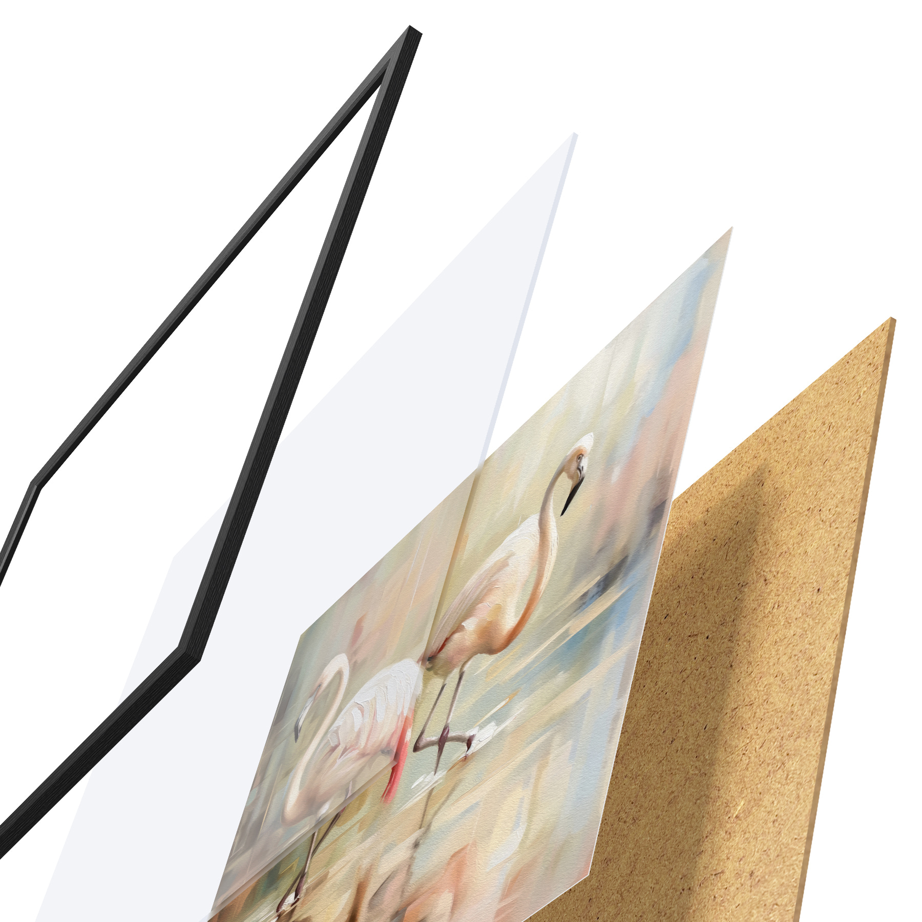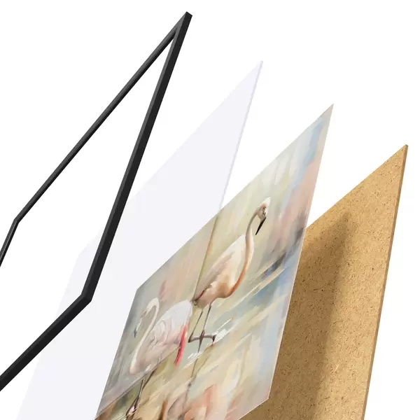 Das Poster besteht aus einem Rahmen, Plexiglas, einem gedruckten Bild und einer Rückwand aus Spanplatten. Dank der Halterungen auf der Rückseite kann das Poster sofort an die Wand gehängt werden.