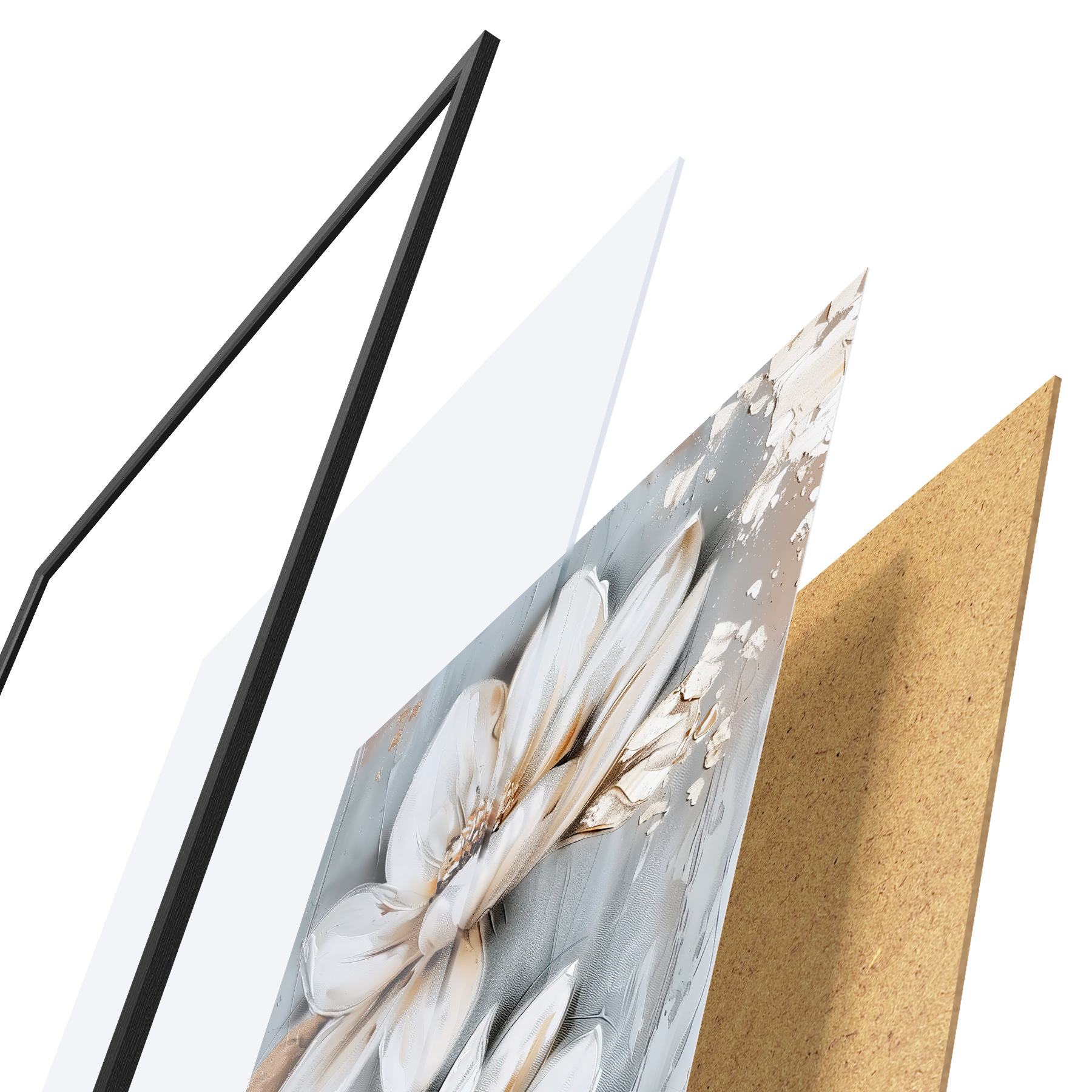 Das Poster besteht aus einem Rahmen, Plexiglas, einem gedruckten Bild und einer Rückwand aus Spanplatten. Dank der Halterungen auf der Rückseite kann das Poster sofort an die Wand gehängt werden.