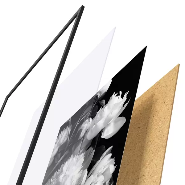 Das Poster besteht aus einem Rahmen, Plexiglas, einem gedruckten Bild und einer Rückwand aus Spanplatten. Dank der Halterungen auf der Rückseite kann das Poster sofort an die Wand gehängt werden.