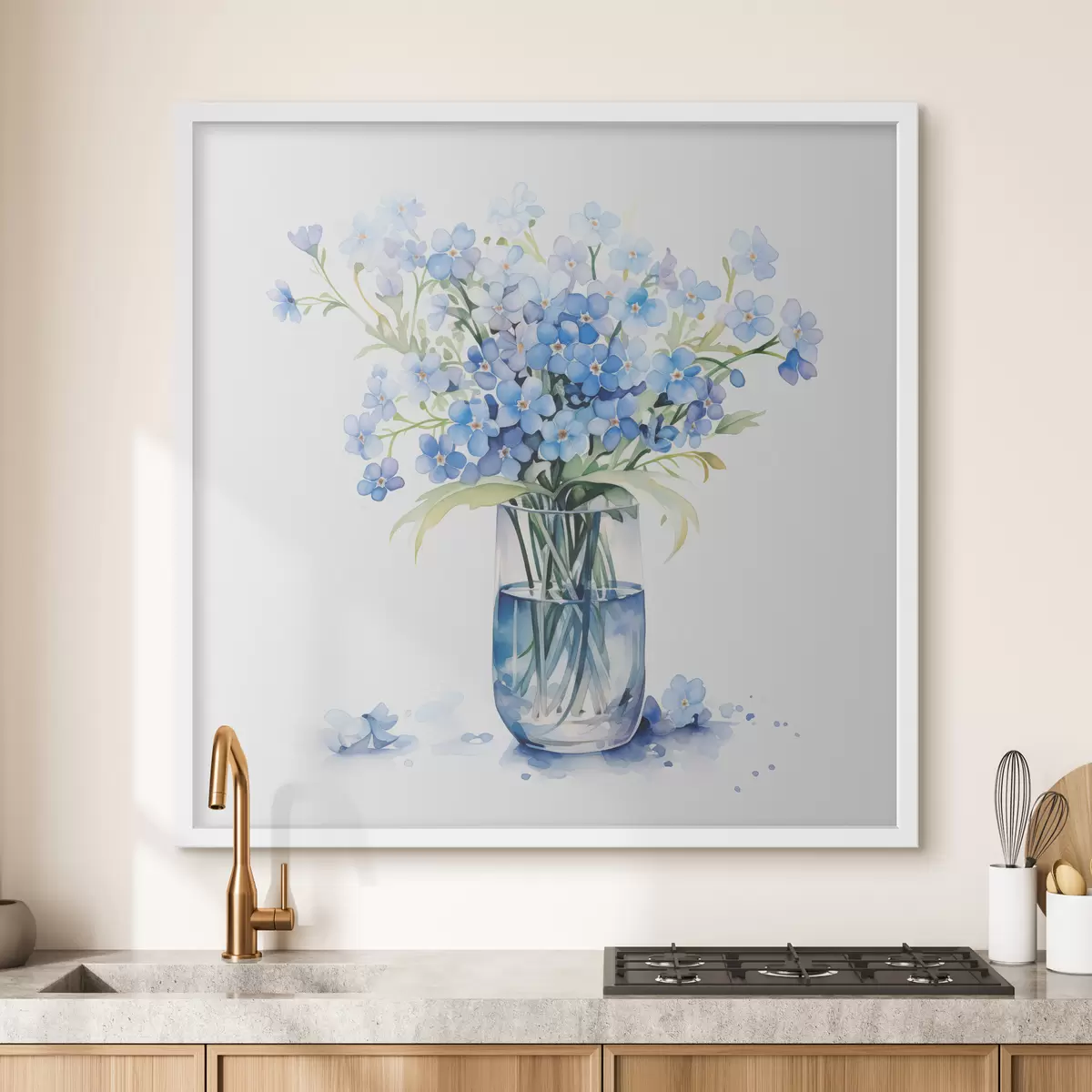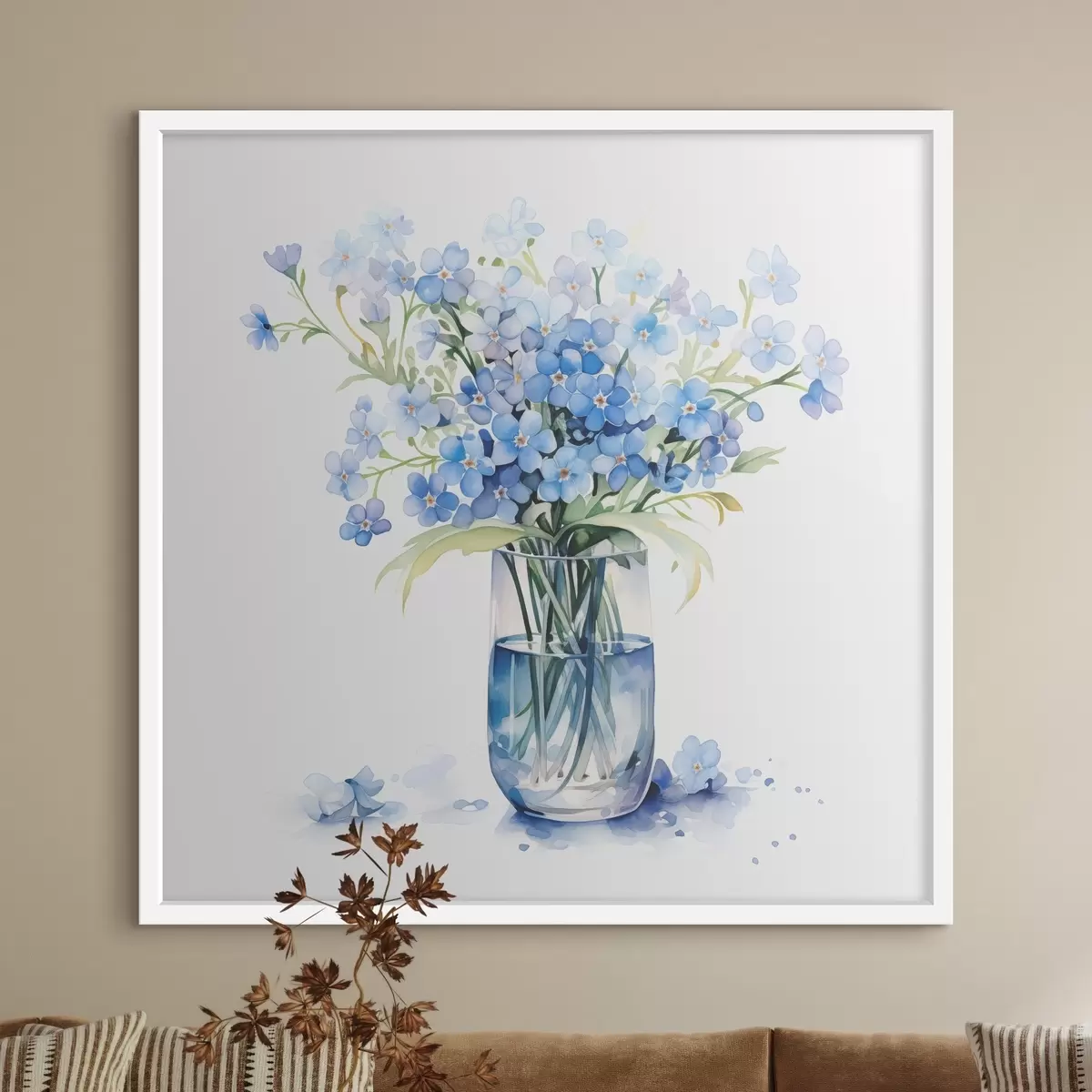 Poster Ein Blumenstrauß aus blauen Blumen in transparenter Aquarellfarbe in einer Vase Nr f39564