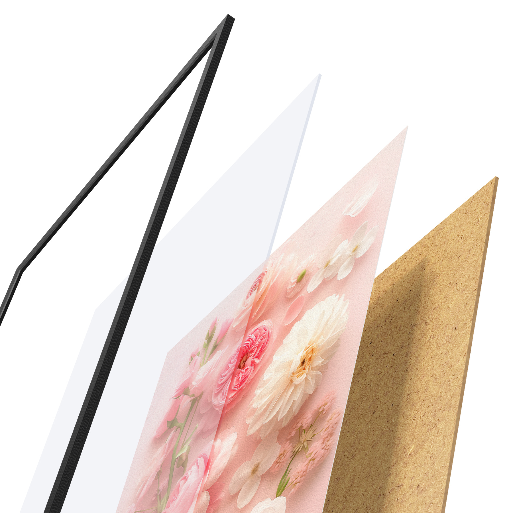 Das Poster besteht aus einem Rahmen, Plexiglas, einem gedruckten Bild und einer Rückwand aus Spanplatten. Dank der Halterungen auf der Rückseite kann das Poster sofort an die Wand gehängt werden.