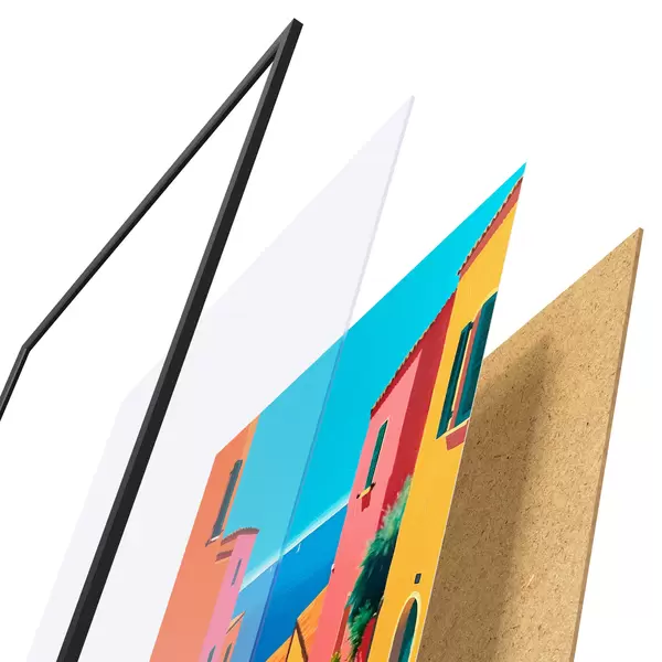 Das Poster besteht aus einem Rahmen, Plexiglas, einem gedruckten Bild und einer Rückwand aus Spanplatten. Dank der Halterungen auf der Rückseite kann das Poster sofort an die Wand gehängt werden.