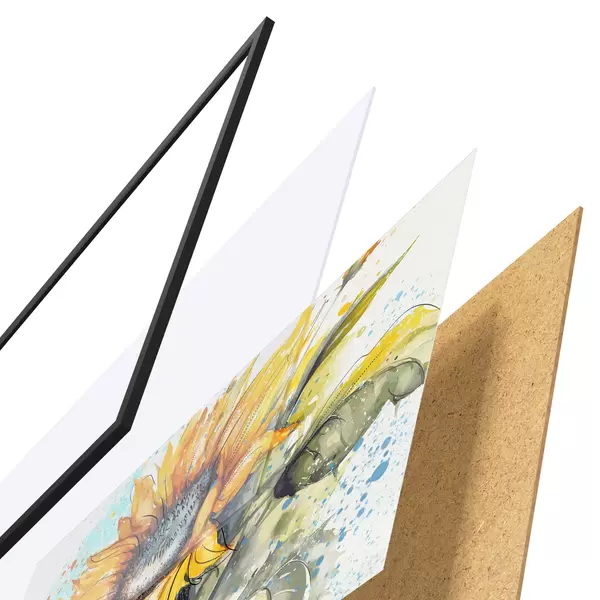 Das Poster besteht aus einem Rahmen, Plexiglas, einem gedruckten Bild und einer Rückwand aus Spanplatten. Dank der Halterungen auf der Rückseite kann das Poster sofort an die Wand gehängt werden.