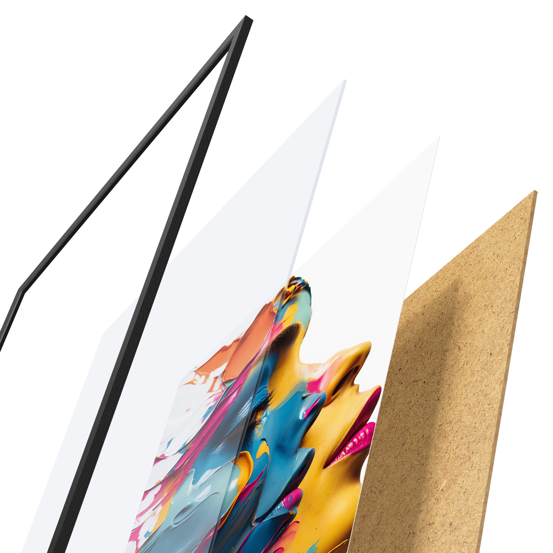 Das Poster besteht aus einem Rahmen, Plexiglas, einem gedruckten Bild und einer Rückwand aus Spanplatten. Dank der Halterungen auf der Rückseite kann das Poster sofort an die Wand gehängt werden.