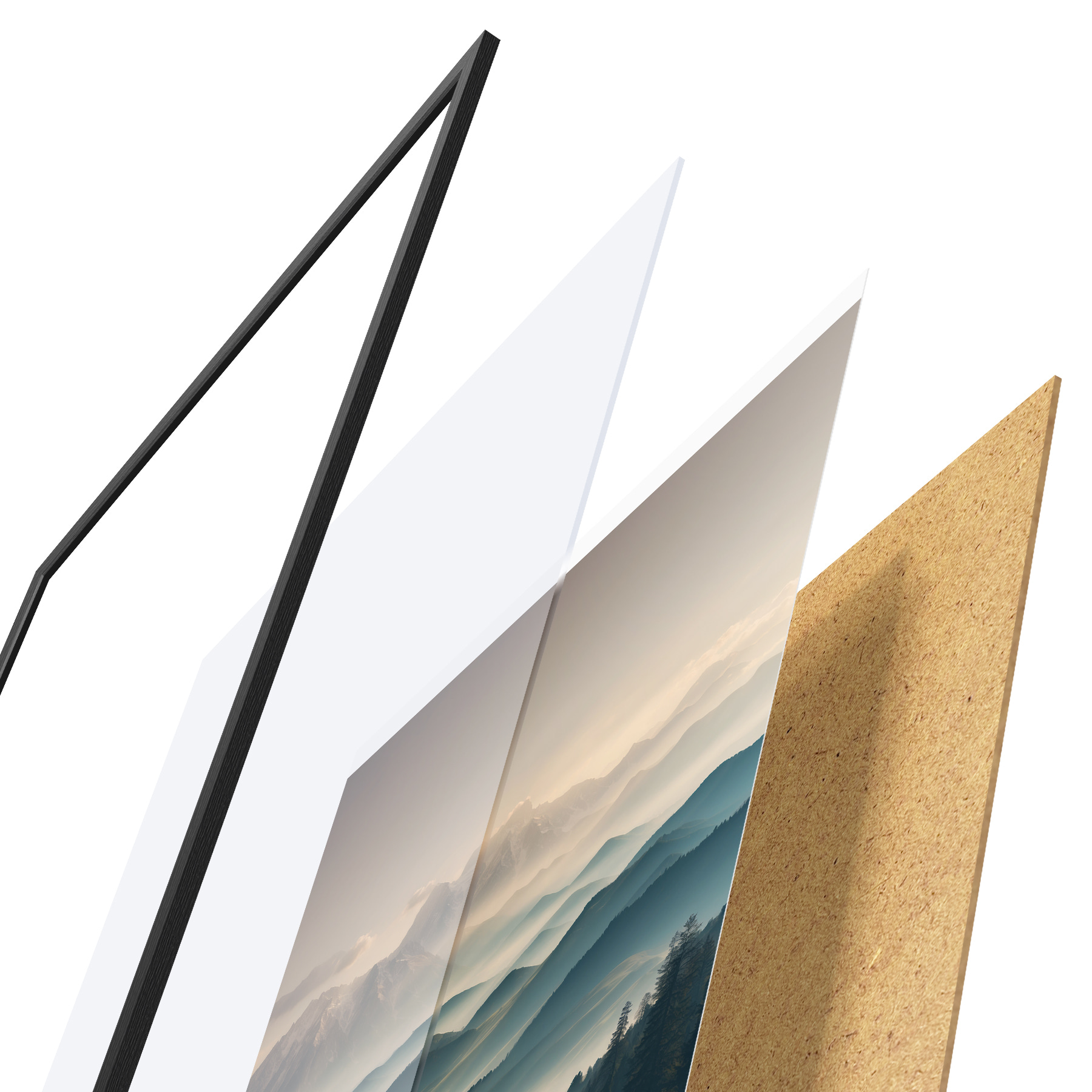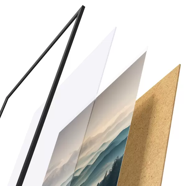 Das Poster besteht aus einem Rahmen, Plexiglas, einem gedruckten Bild und einer Rückwand aus Spanplatten. Dank der Halterungen auf der Rückseite kann das Poster sofort an die Wand gehängt werden.