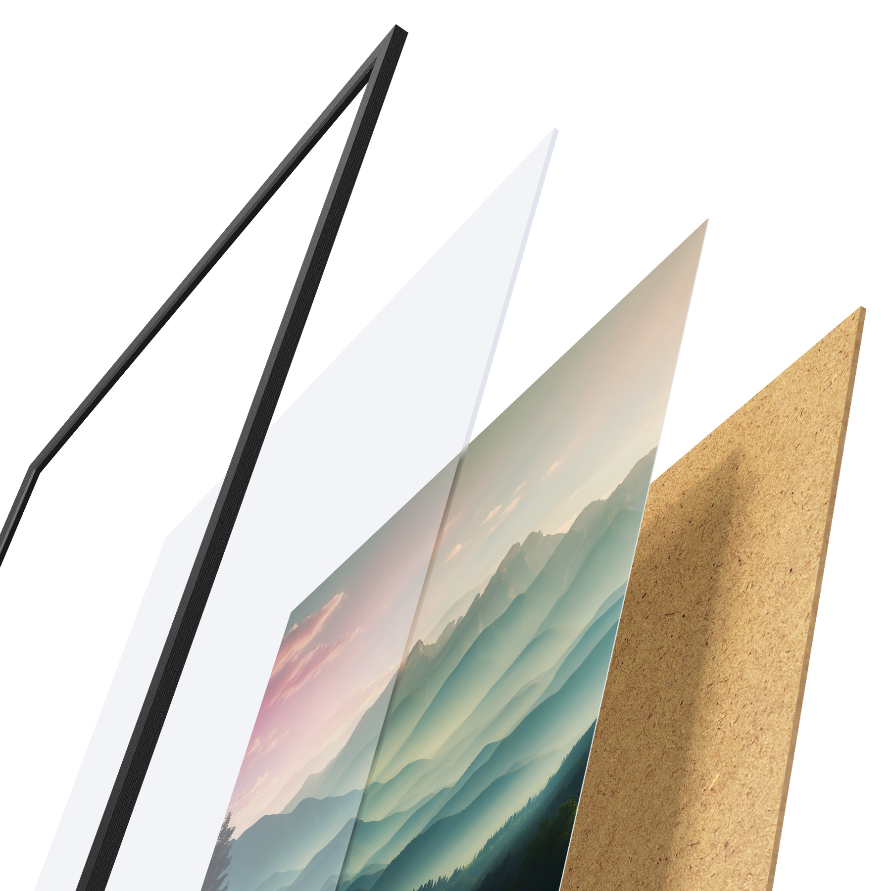 Das Poster besteht aus einem Rahmen, Plexiglas, einem gedruckten Bild und einer Rückwand aus Spanplatten. Dank der Halterungen auf der Rückseite kann das Poster sofort an die Wand gehängt werden.