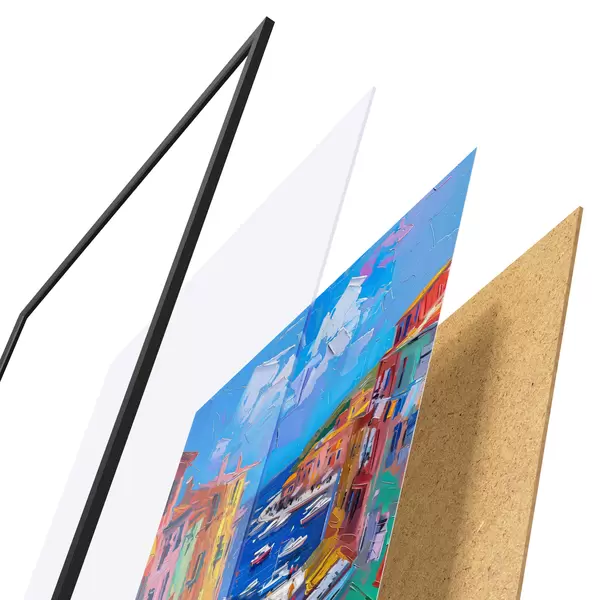 Das Poster besteht aus einem Rahmen, Plexiglas, einem gedruckten Bild und einer Rückwand aus Spanplatten. Dank der Halterungen auf der Rückseite kann das Poster sofort an die Wand gehängt werden.
