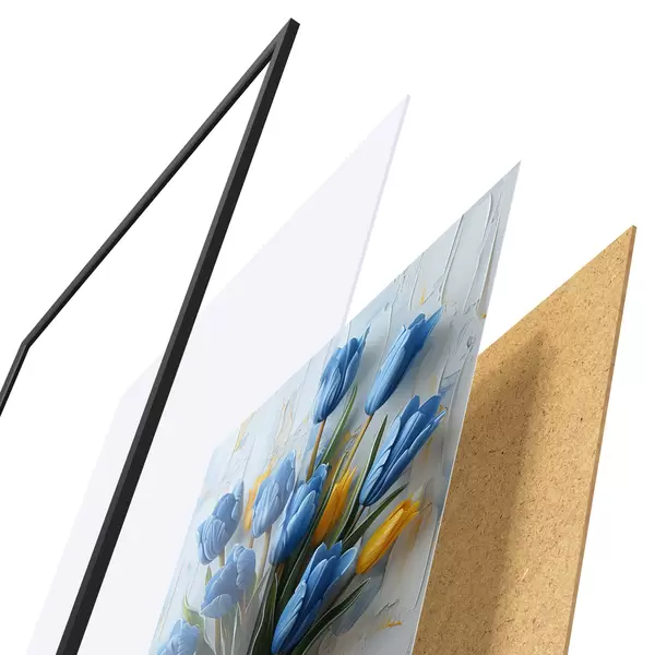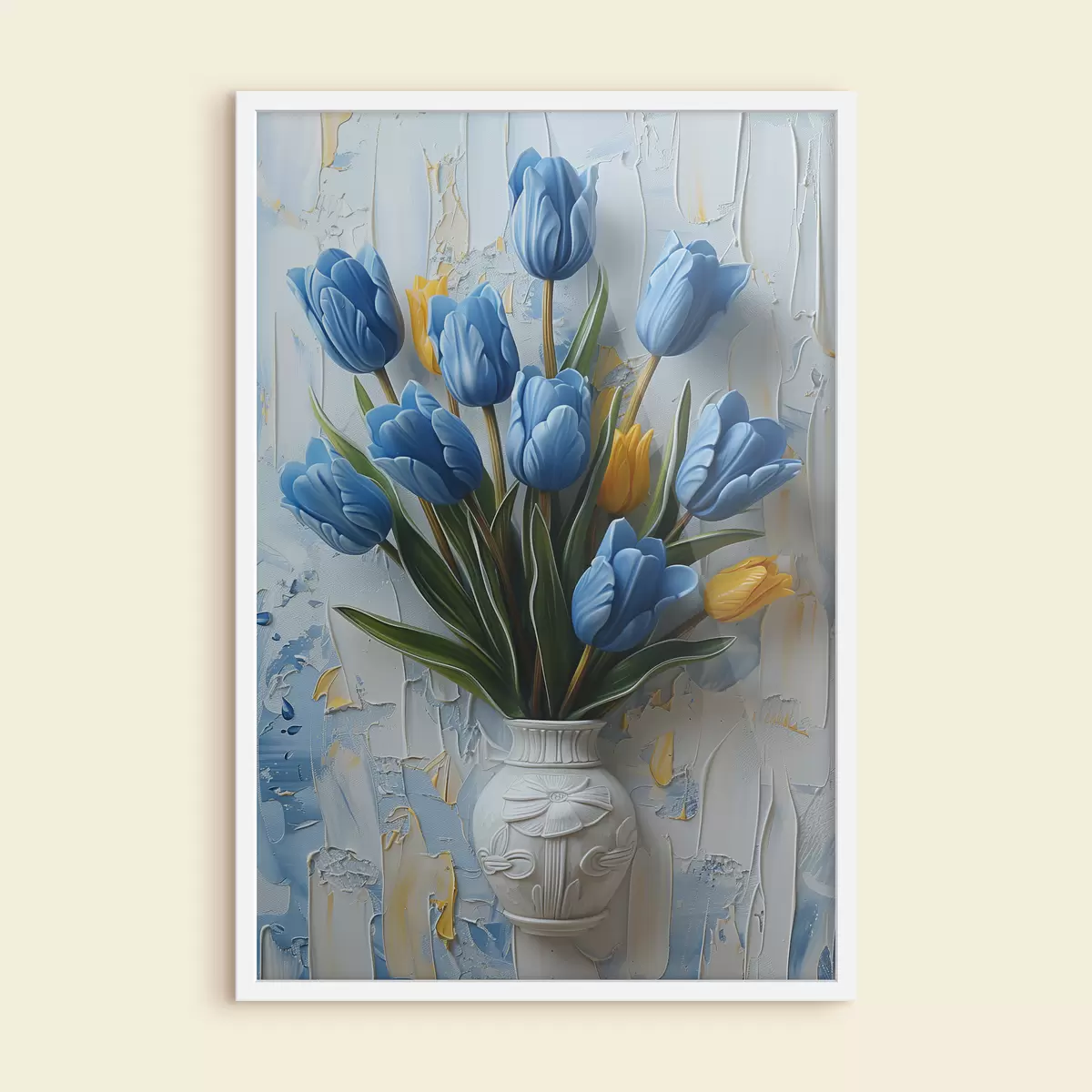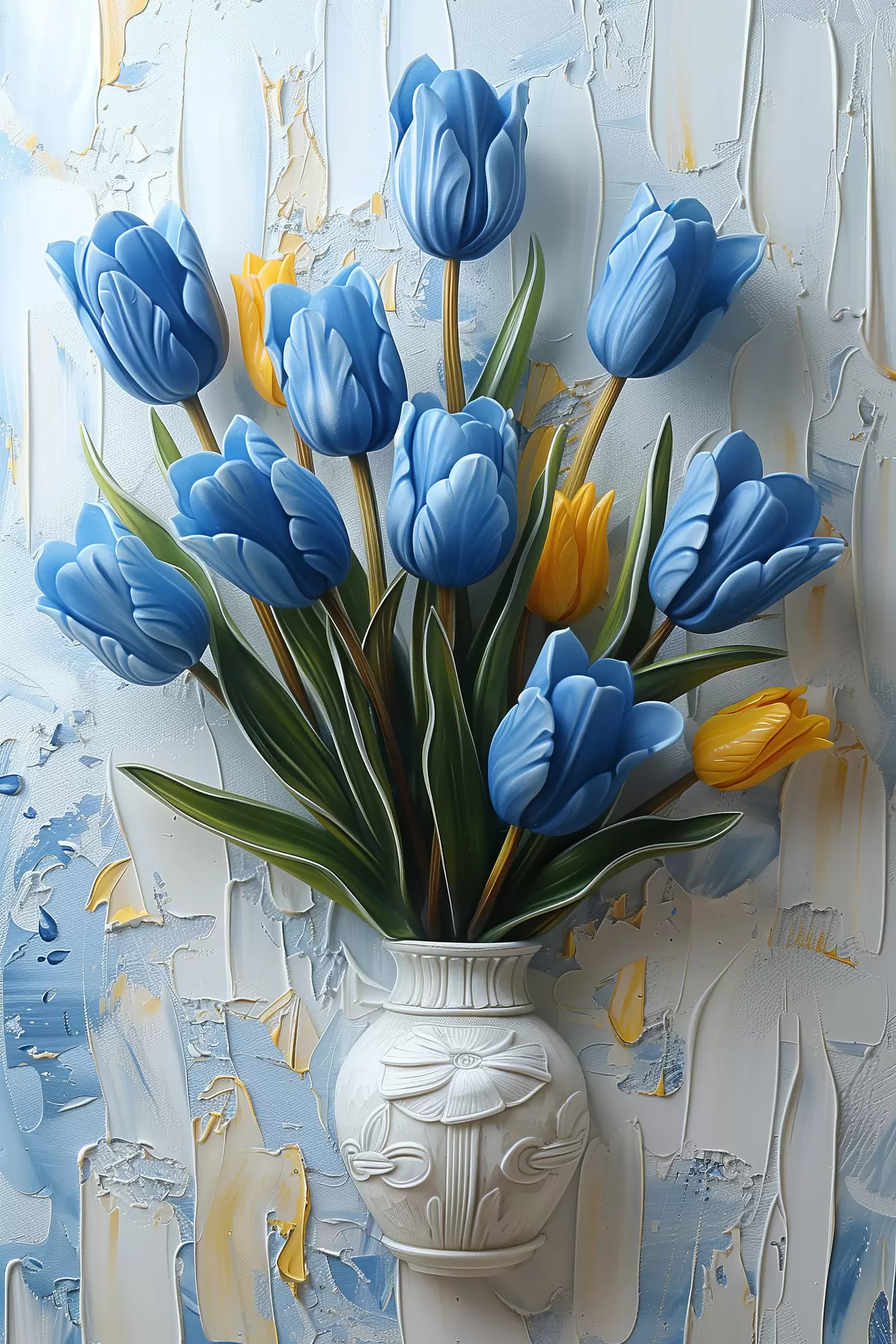 Poster Blaue und gelbe Tulpen in 3D: elegantes ölgemaltes Wandbild mit weißem und hellblauem Hintergrund und gravierter Vase f39637