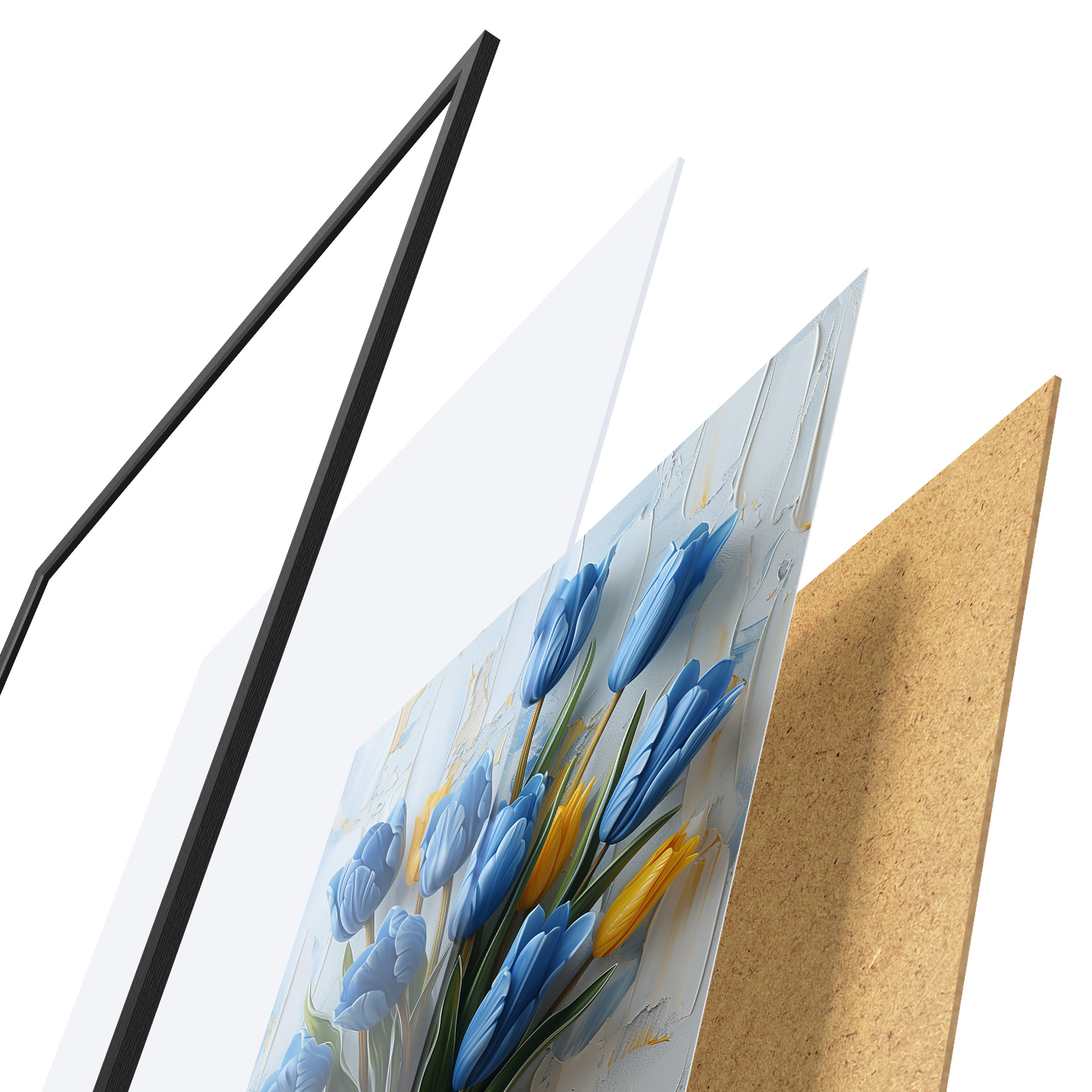 Poster Blaue und gelbe Tulpen in 3D: elegantes ölgemaltes Wandbild mit weißem und hellblauem Hintergrund und gravierter Vase Nr f39637