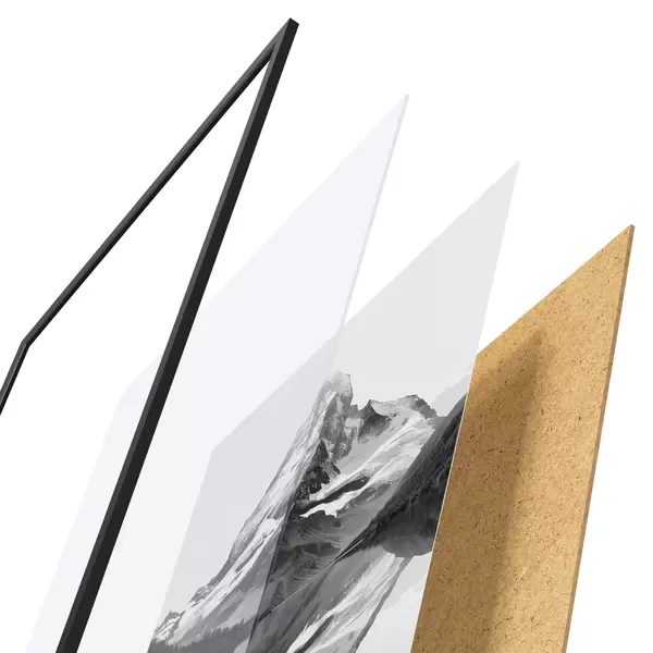 Das Poster besteht aus einem Rahmen, Plexiglas, einem gedruckten Bild und einer Rückwand aus Spanplatten. Dank der Halterungen auf der Rückseite kann das Poster sofort an die Wand gehängt werden.