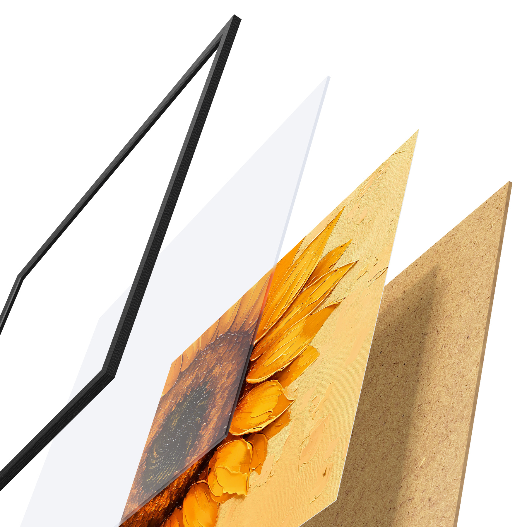 Das Poster besteht aus einem Rahmen, Plexiglas, einem gedruckten Bild und einer Rückwand aus Spanplatten. Dank der Halterungen auf der Rückseite kann das Poster sofort an die Wand gehängt werden.