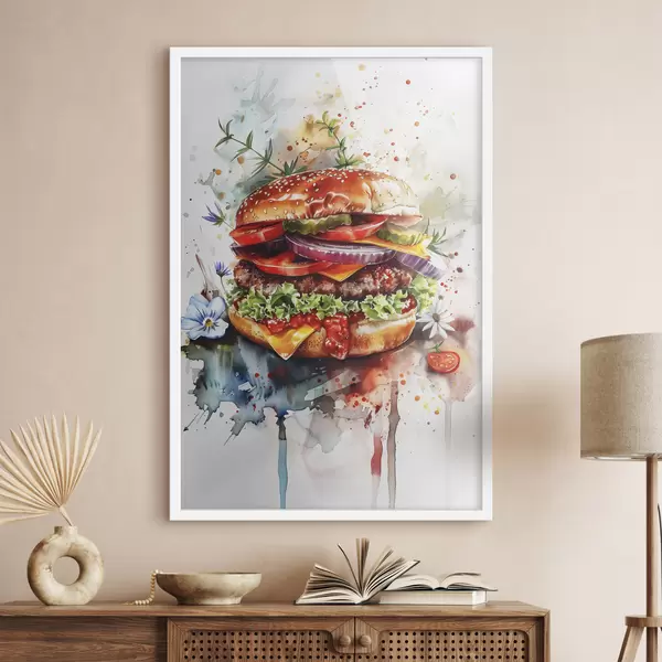 Poster Leckerer Burger mit Fleisch, Blumen, Aquarell, Food Art f39699