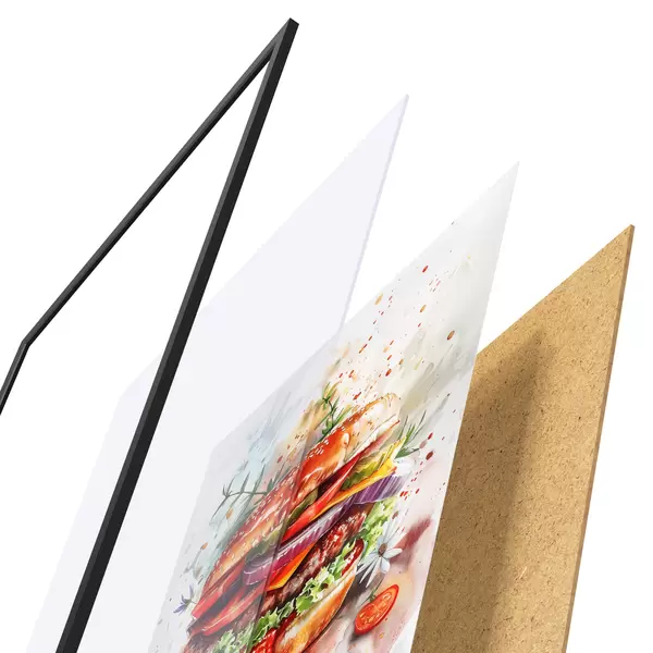 Das Poster besteht aus einem Rahmen, Plexiglas, einem gedruckten Bild und einer Rückwand aus Spanplatten. Dank der Halterungen auf der Rückseite kann das Poster sofort an die Wand gehängt werden.