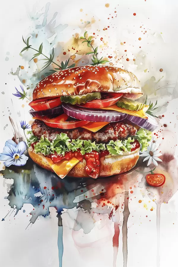 Poster Leckerer Burger mit Fleisch, Blumen, Aquarell, Food Art f39699