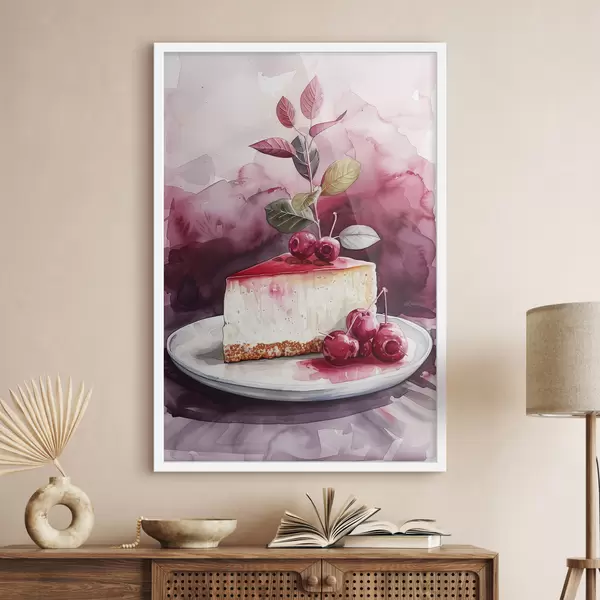 Poster Aquarell-Käsekuchen mit Kirschen, elegante Lebensmittelkunst, rote und violette Farben Nr f39700